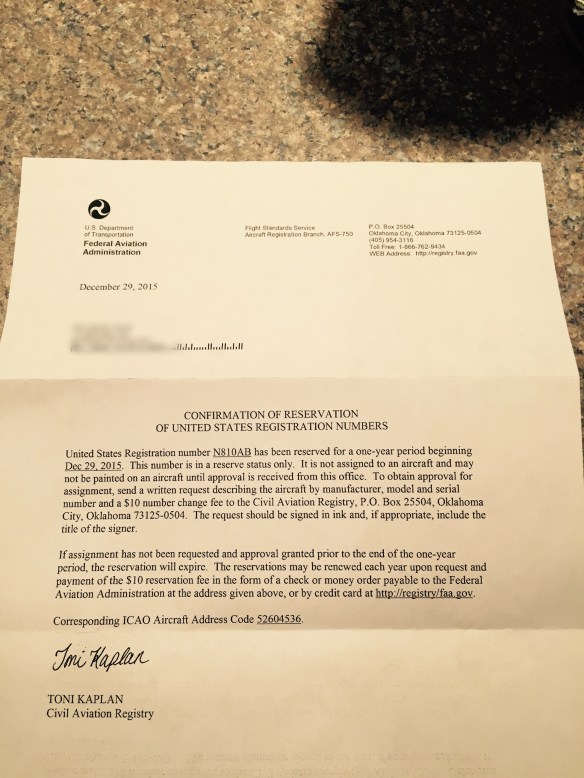 In choosing an N number, I really wanted the numbers 10 to signify it being an RV-10, and my initials (AB). I searched all possible combos, and only found two available: N810AB and N910AB. I chose the 810 variant as it rolls off the tongue a bit smoother (niner) and has less syllables.