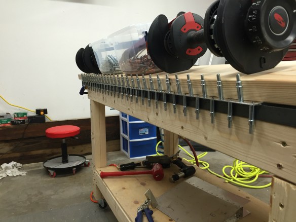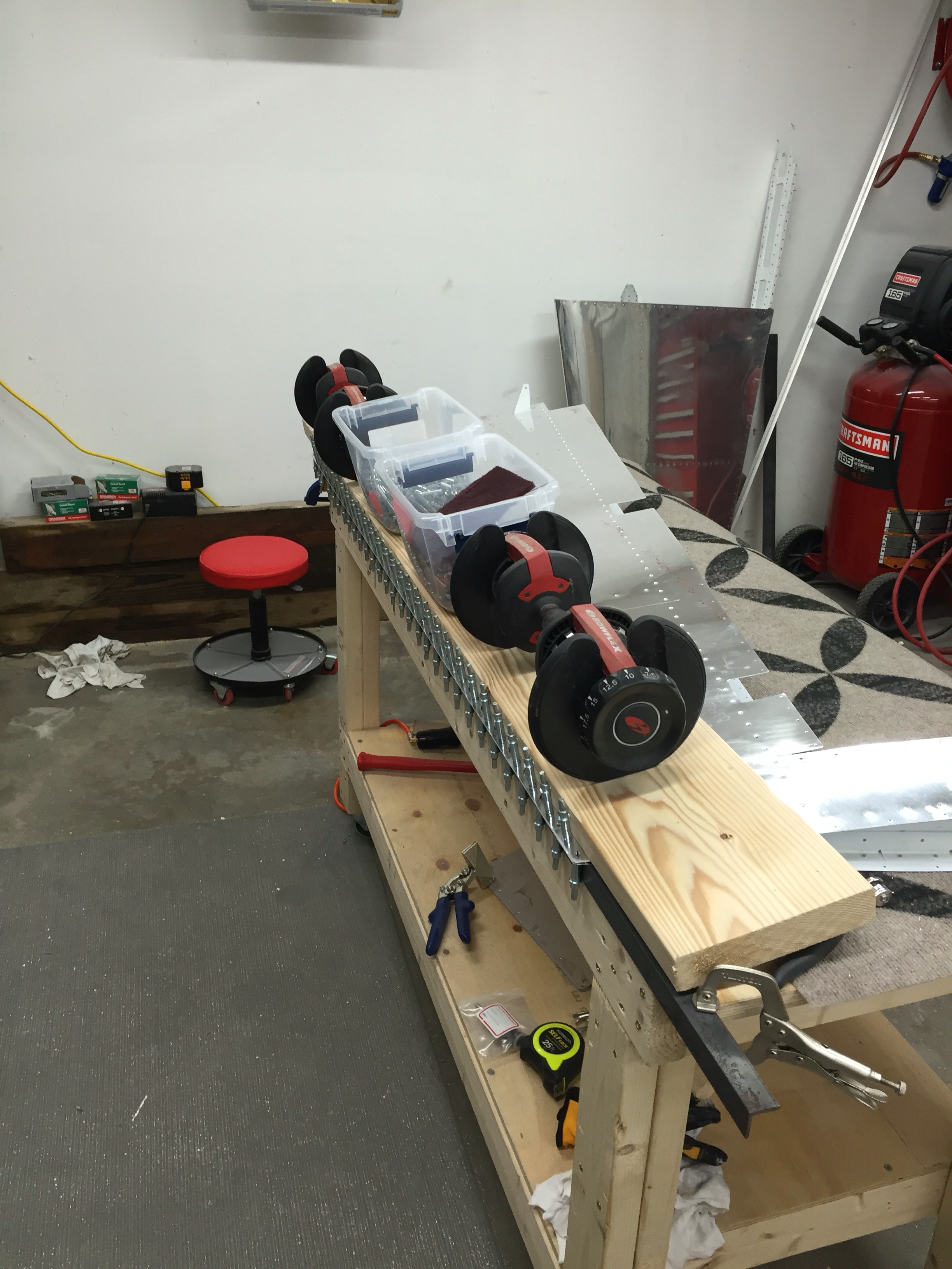 The 3M VHB tape from Van’s showed up this week, so I was ready to start back on the rudder again. Thankfully, this time the tape VAN’s sent worked like a charm. This further validated that the tape I got from Amazon was junk. The night that the tape came in, I adhered it to the trailing edge wedge piece. Tonight I attached the wedge to the right skin which sits flat on the table. Clekos were installed from the underside of the skin in the trailing edge at the end of each stiffener. I then got my wife to help me as we rolled the left skin onto the right skin, stopping at each stiffener location to finish the internal riveting of the stiffeners and shear clips, peeling back the 3M tape on the top of the wedge piece as we went. Once this was done, I finished riveting the lower rib to the skin, and installed clekos in the rest of the holes of the trailing edge in an alternating fashion. I clamped a 6′ steel angle to the edge of the table to give a straight and uniform edge. Finally, I put a wide board over the skin with some weights on it to hold it down and let the surfaces bond to each other. I’ll leave it overnight like this. Good progress tonight!