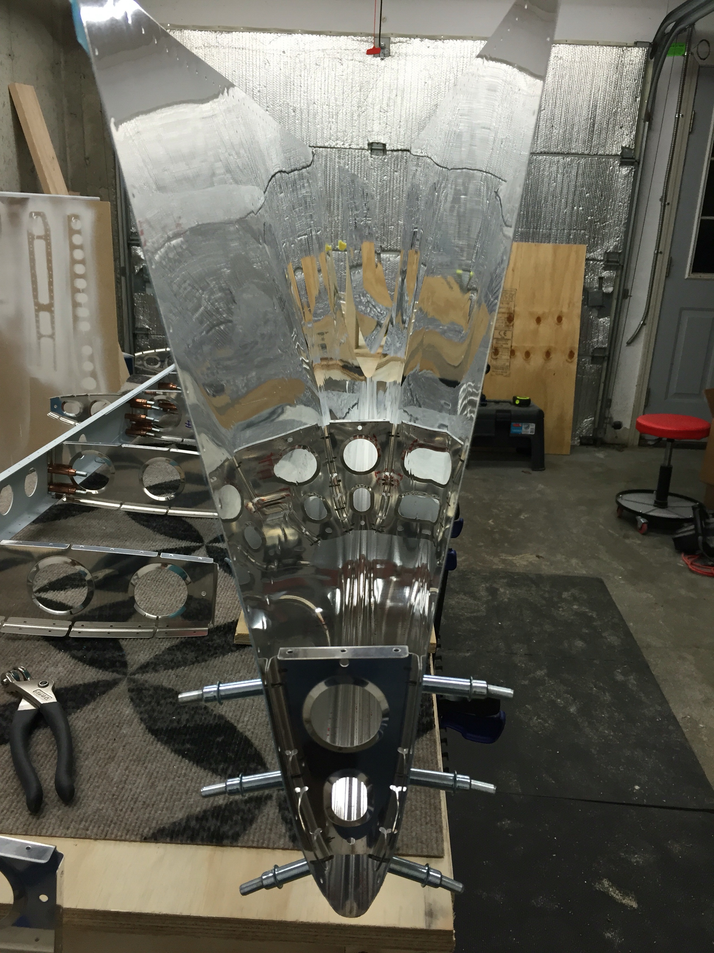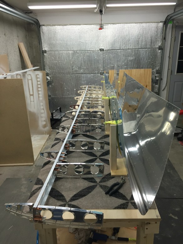 I’ve spent what time I’ve had working on getting the nose ribs and inspar ribs all match drilled to the front spar and fabricating cradles to hold the assembly for final drilling and riveting. I decided to try straps for the cradles instead of making them rigid after seeing what Jason Ellis did. The cradle doesn’t influence the shape at all, it’s simply a method to hold things up while working on the HS. The straps also allow a little bit of movement, if needed.