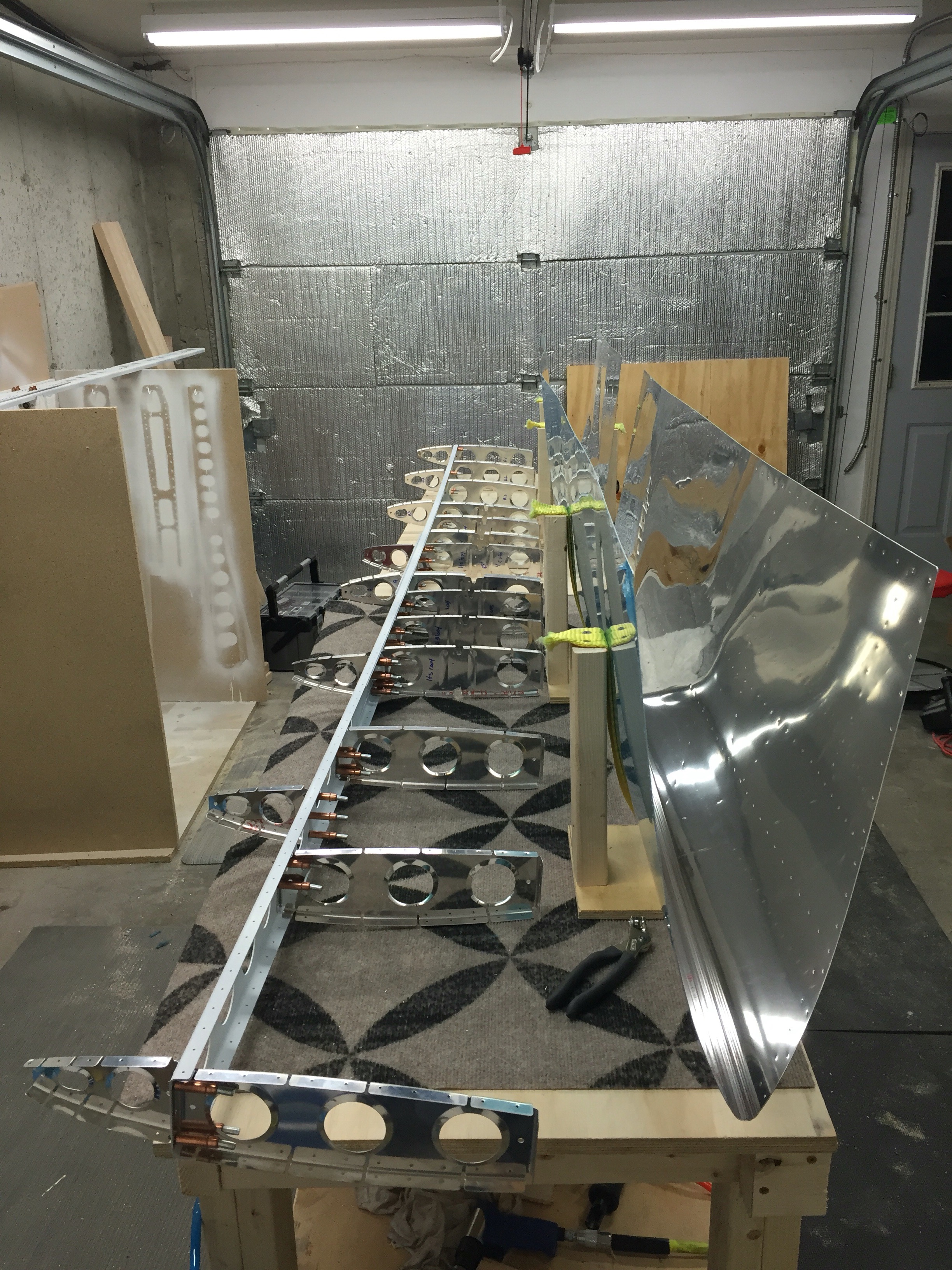 A picture of the Horizontal Stabilizer skeleton, with all the nose ribs and in-spar ribs attached.