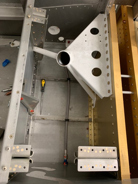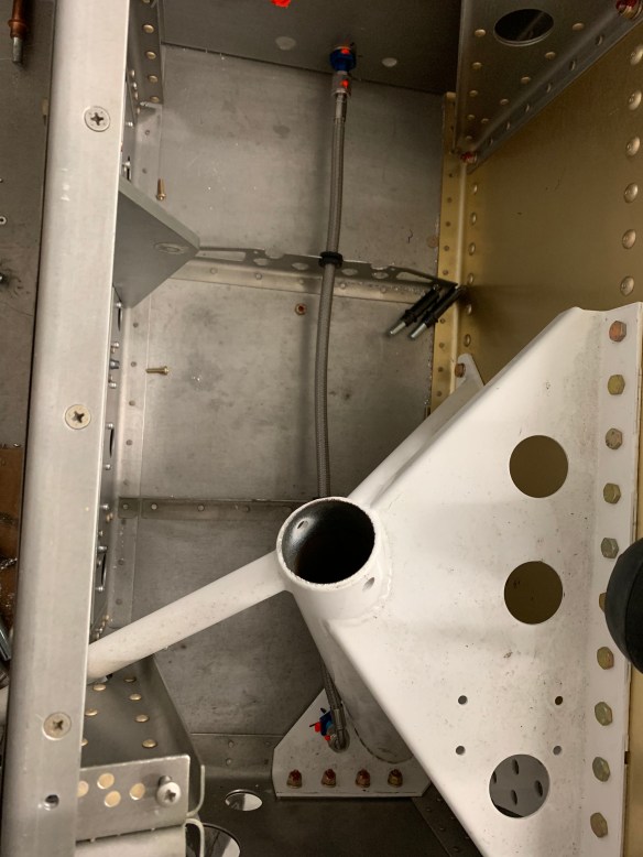 • Possibly I suppose if I had enough slack in the line to use the aft hole. I didn’t actually check that. There are also 2 more lines that go between the rudder pedals on each side that use additional holes which I’m worried about. I need to drill them to a larger diameter to fit the AN fitting through the hole and I’m worried that they are too close together, so I may need to use that hole for one of those lines.