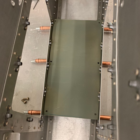Then I riveted nut plates onto the angles to accept six #8 screws, clekoed them in place, and screwed the sheet onto them.