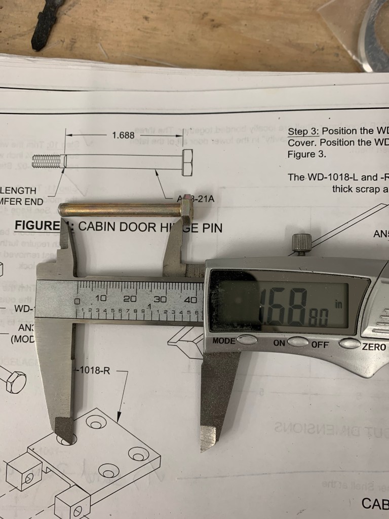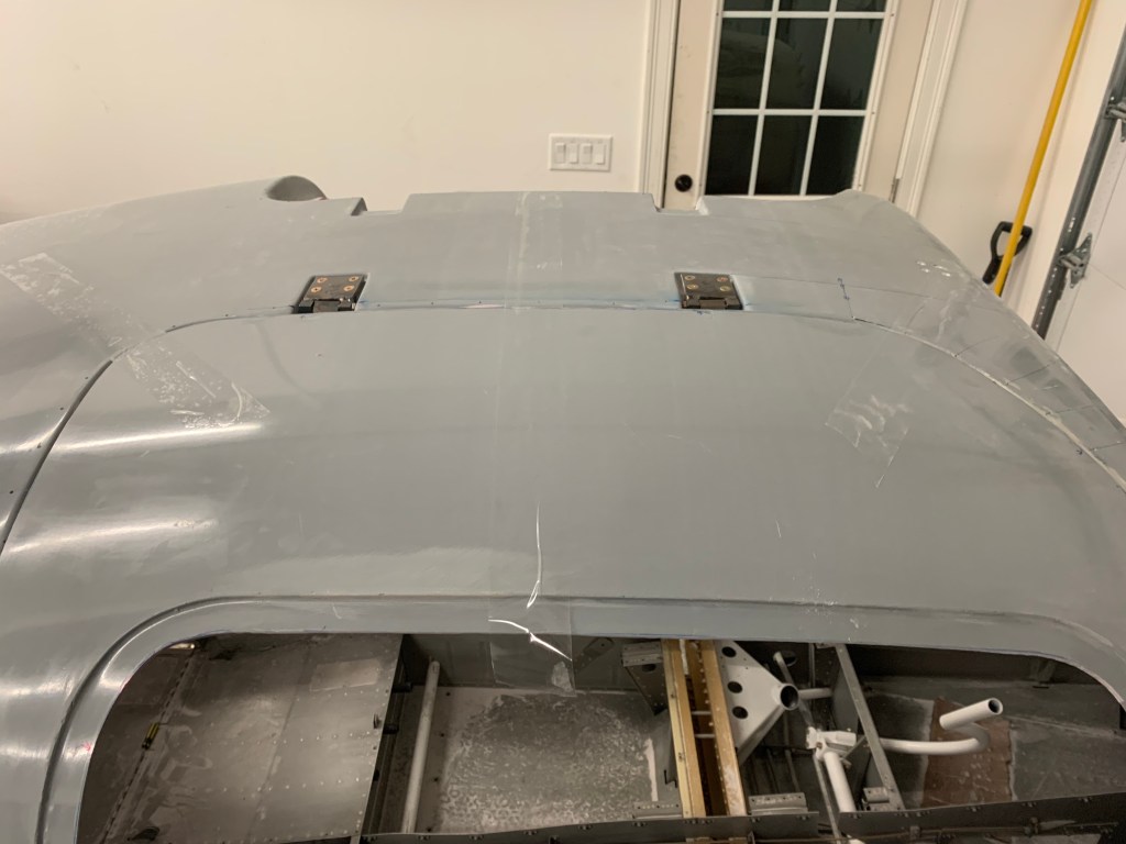 Then it was on to preparing the hinges. You use an AN3 bolt with the threads cut off as a hinge pin. Then proceed to get the hinges up in their pockets and match drilling the 4 holes. The main thing here is identifying that the hinges are different and getting them in their proper location. You can actually see in the hinge pin picture below that the hinge “legs” where the pins pass through actually have an offset to them to match the curve of the cabin top. It’s important for the high side on the forward hinge to point forward and the high side of the aft hinge to point aft. The lower points should be inboard.