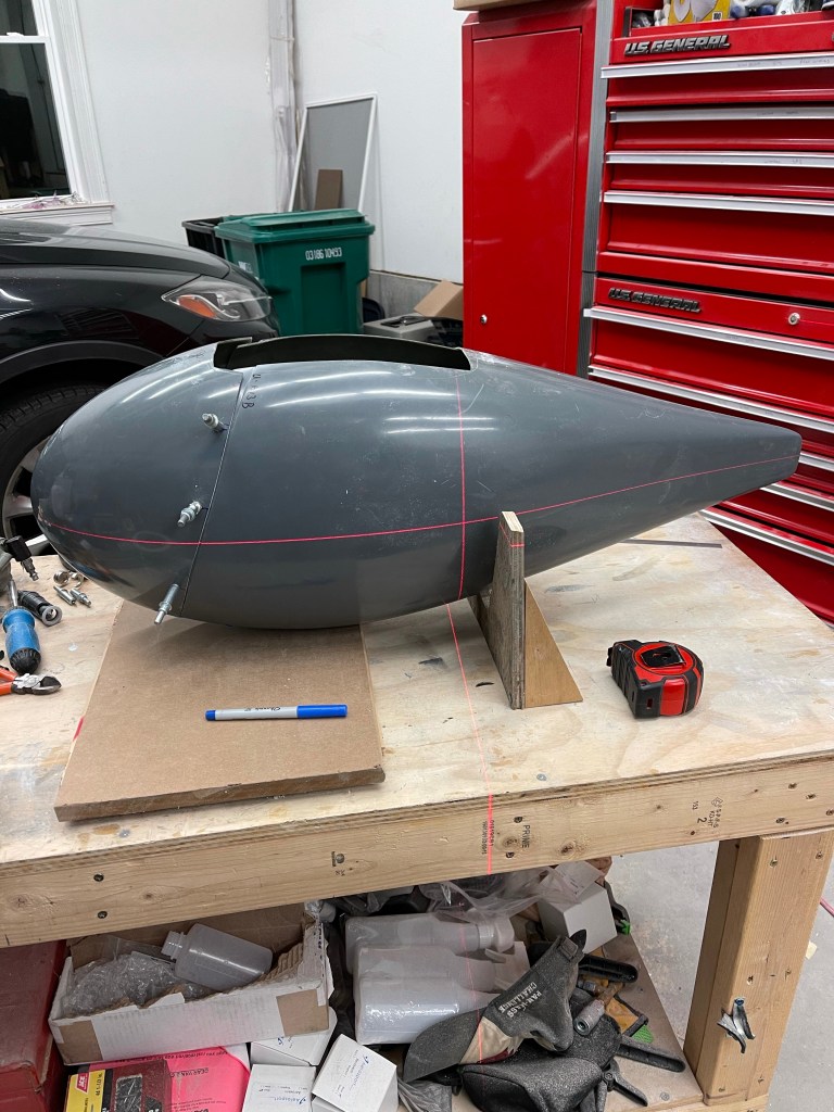 It’s then time to start working on fitting the faring to the nosewheel. One thing that I did that wasn’t outlined in the plans was to mark the location of the nose fork on both sides and extend those line rearward.. As you can tell by the tape and multiple lines, this did take a couple of iterations to get right. I ended up using a laser level to mark them after aligning the beam with the forks. A wooden spacer is also taped to the top of the tire.