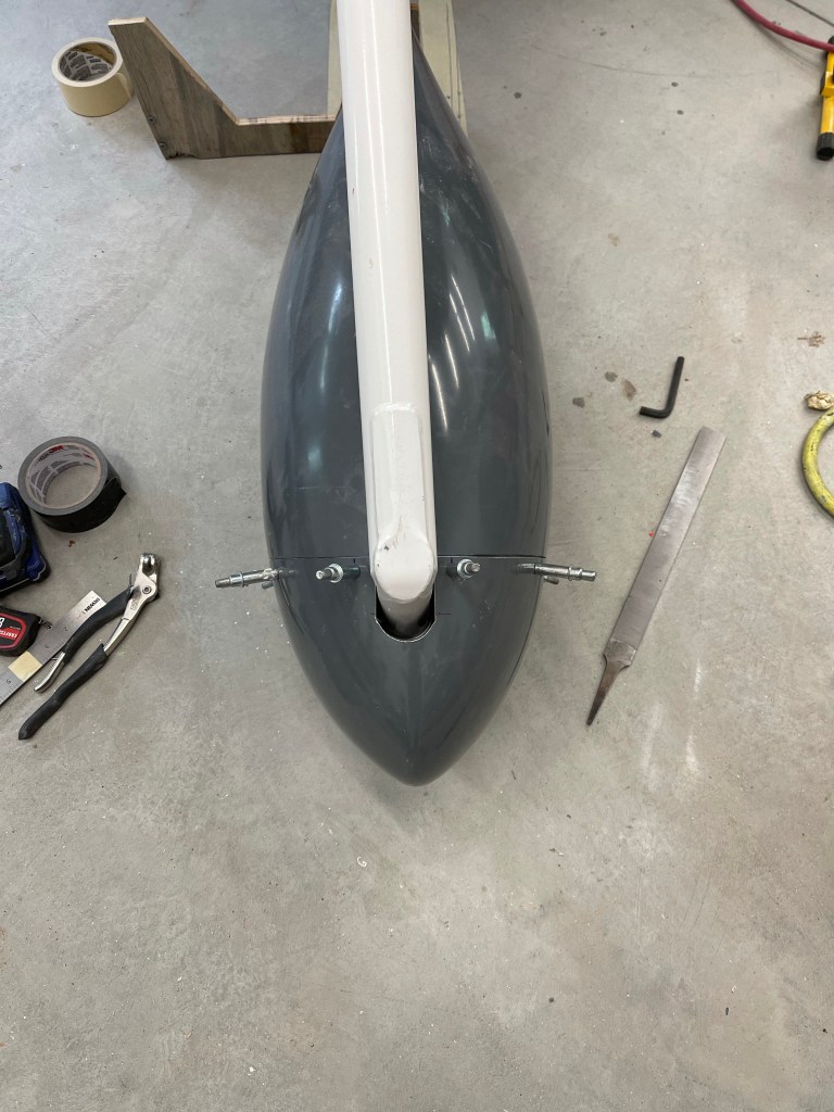 I then followed the plans to drill a 1.5″ hole into the front fairing and trim the tangent lines to allow clearance for the nose gear leg. Once that was done, I was able to file a little bit more along the edges and get the front re-cleco’ed to the rear.