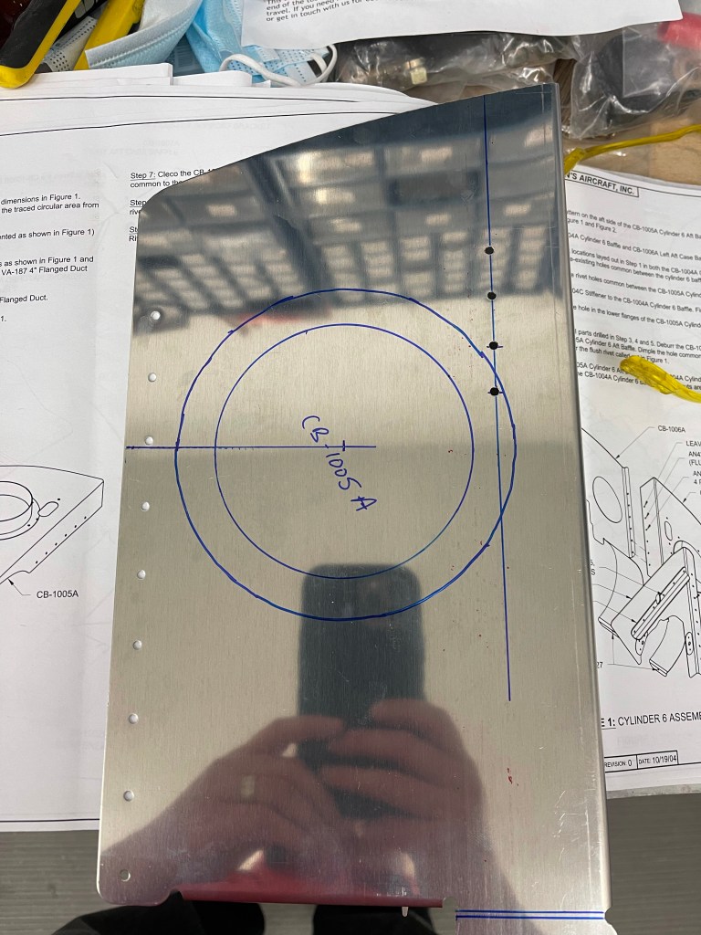 You start off by marking up the #6 cylinder baffle for the scat tube that’ll go to the oil cooler. Also some holes for the top spark plug wires to pass through. Below you see the flange located in place and some holes drilled per plans.