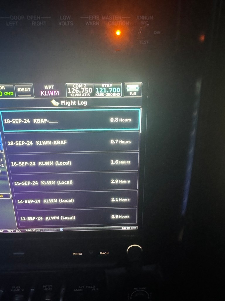 A couple of pics of the flight log on the EFIS and the flight track to dinner.