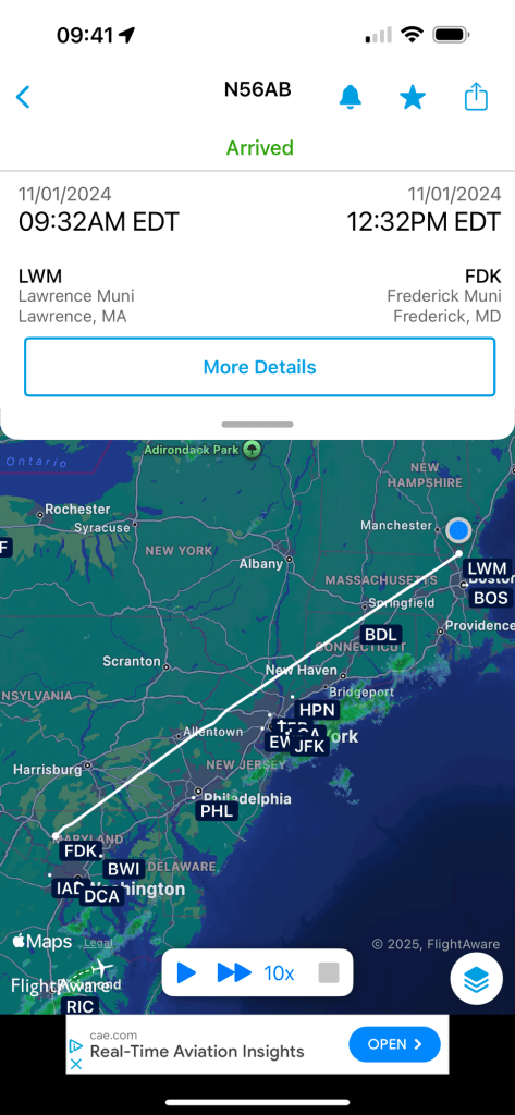 My friend, and CFI, Scott had asked if he could tag along for the trip, so we shoved off on Friday Nov 1st to drop the plane off at Evoke. My plan was to leave Friday and we had a commercial flight scheduled late Sunday afternoon in Atlanta. That would give us a couple of days to account for weather, if needed. The weather turned out to be decent for the majority of the day. It was, however, breezy. Another gusting into the lower 30 Kts on the surface kind of day. Winds aloft were also brutal and my plan to fly down to Frederick, MD area had us pointed directly into the wind. We stayed low at 4500′ to keep out of the wind as much as possible. Even so, we saw 40-50 Kts headwind on the nose.