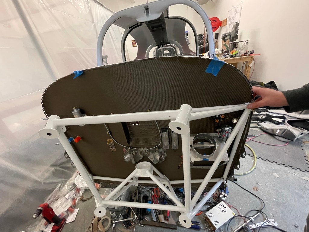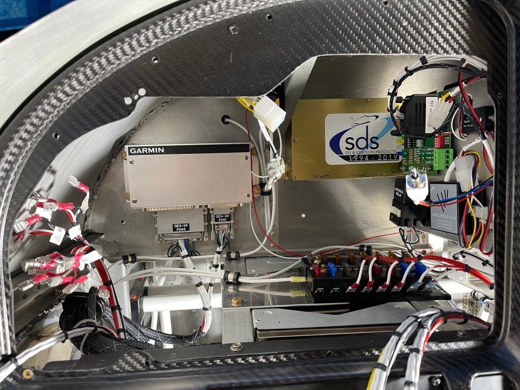 Wiring Harness removedCarbon fiber panelwith avionics trays. Metal subframe with shelf for various components.