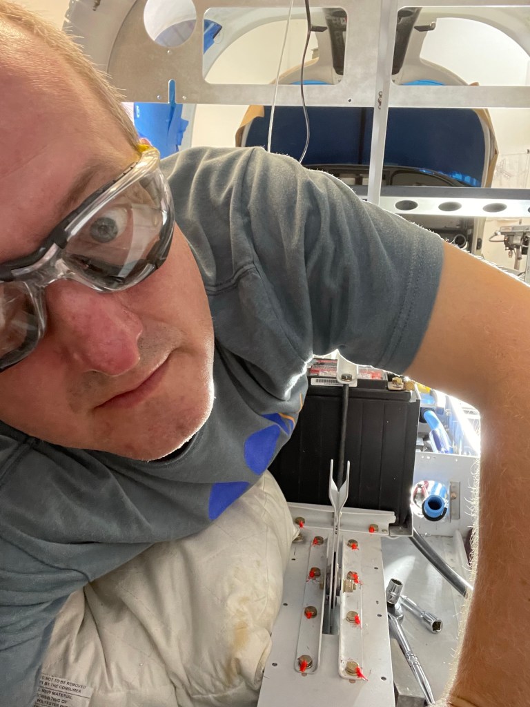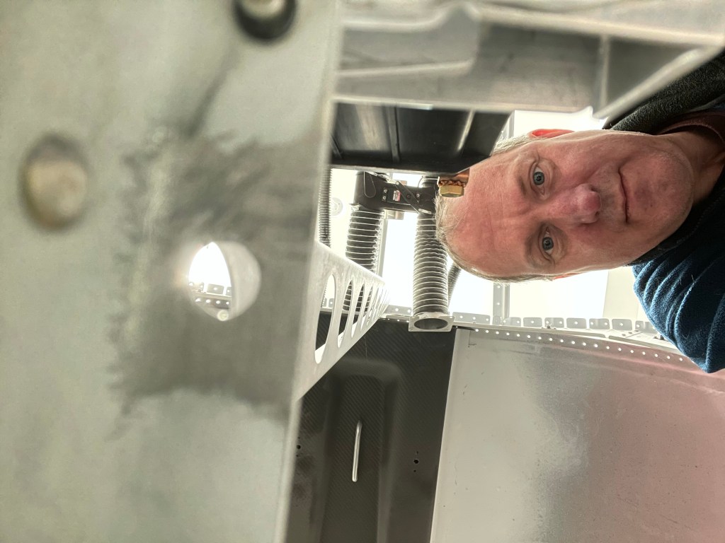 My ugly mug taking a pic of the battery area to see how good I’ve scraped the primer off of the metal where a battery ground cable will be locally connected to the structure.. 🙂