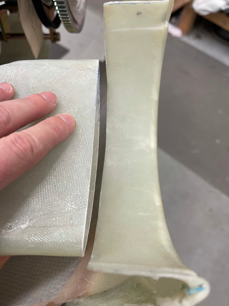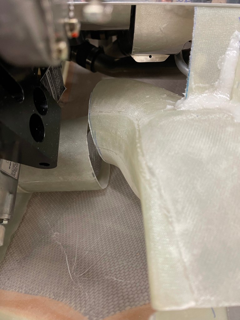 Then it was time to wrap a single piece of cloth to span the gap between the two tubes to join them back together. You can see the black line I marked for alignment. I also used a jack to allow the tube to sit on vs. having gravity pull down on the tube while this was curing. I used a single layer on the outside, because clearance to the cowl is a bit tight. Once this cured, I placed a thick layer of flox on the inside of the tube to fill the gap and create more strength in this area.