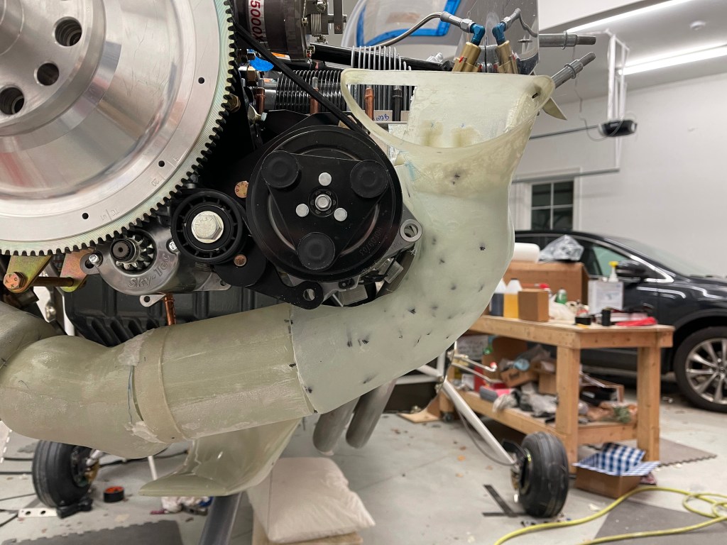 Now that the basic shape of the left intake tube was formed, it was time to sand it down to perfect shape. I used mostly the Permagrit sanding blocks for this task, and it was relatively easy. Of course, at some points I had to put the lower cowl on to make sure I had clearance to it. I also carved out a bit more in the back for the AC hose connections to the compressor.