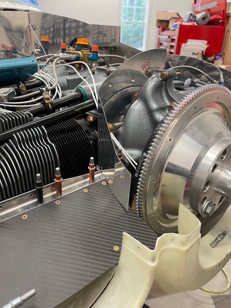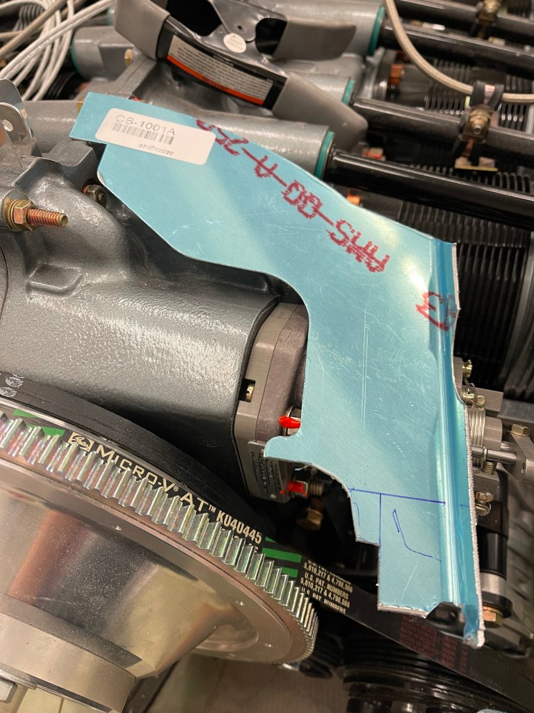 I really had to trim away the left center baffle piece. It interferes with the AC compressor quite a bit. So I decided to cut the forward most section completely off, leaving enough material to rivet more metal to later, and also the notch for the aft part of the prop governor. Later, I’ll work on a custom piece to go over the prop governor and along the ramp to the intake area.