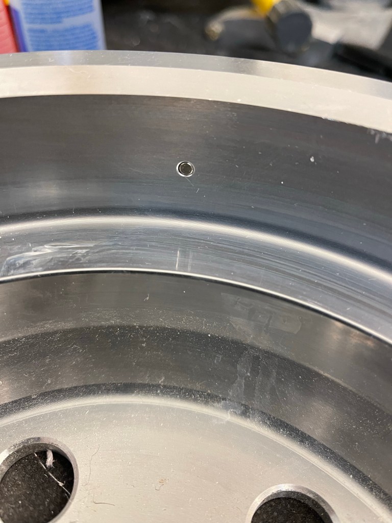 Once everything cured.. I decided to buy the Devcon Titanium putty recommended in the in the linked blog. It is expensive and you really need a very small amount compared to what is provided, but I didn’t want to skimp on this. I prepped the flywheel and applied the putty to each hole location as shown below.