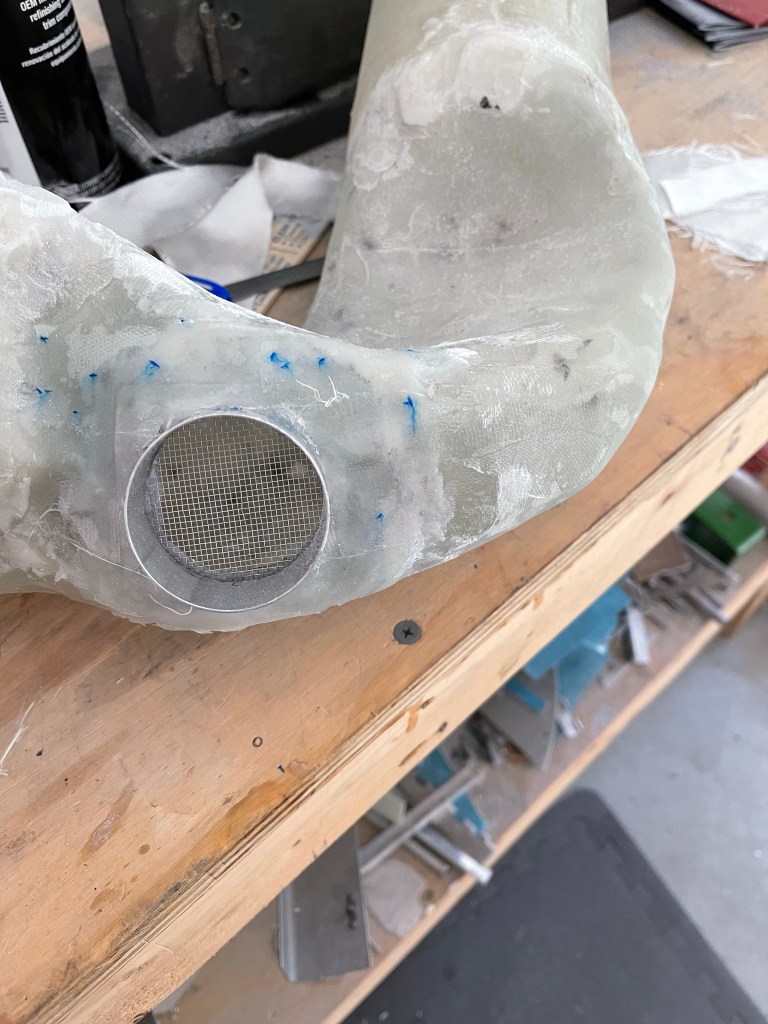 Once cured I test fit the tube once again to make sure things looked good. below you can see the blue sharpie lines that I used to mark the cloth for cutting pieces to shape.