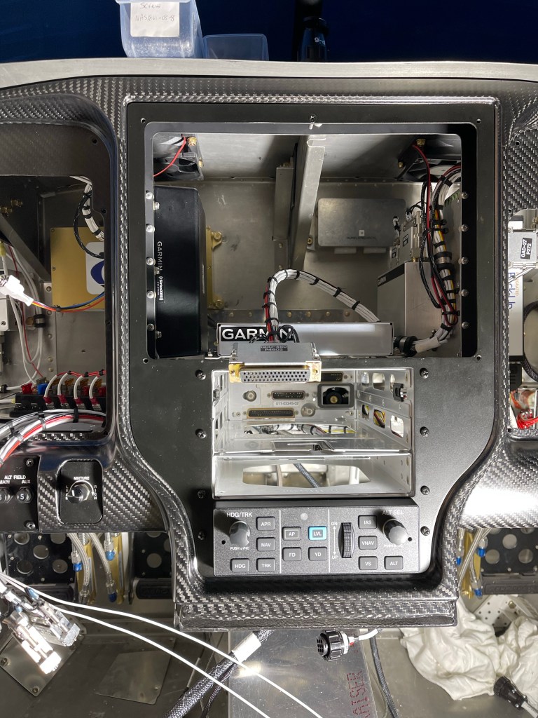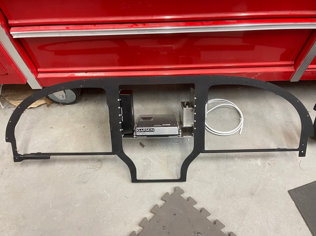 I spent some time getting the metal subframe in place, followed by the carbon fiber panel with the avionics trays. This first test fit was mostly done to mark the sub panel where I’ll need to cut away and reinforce making room for the connectors on the back of the 650 etc.. Not a whole lot needs to be removed just a small rectangle near the bottom and really just for the connectors and so the wiring harness doesn’t get bent too much.