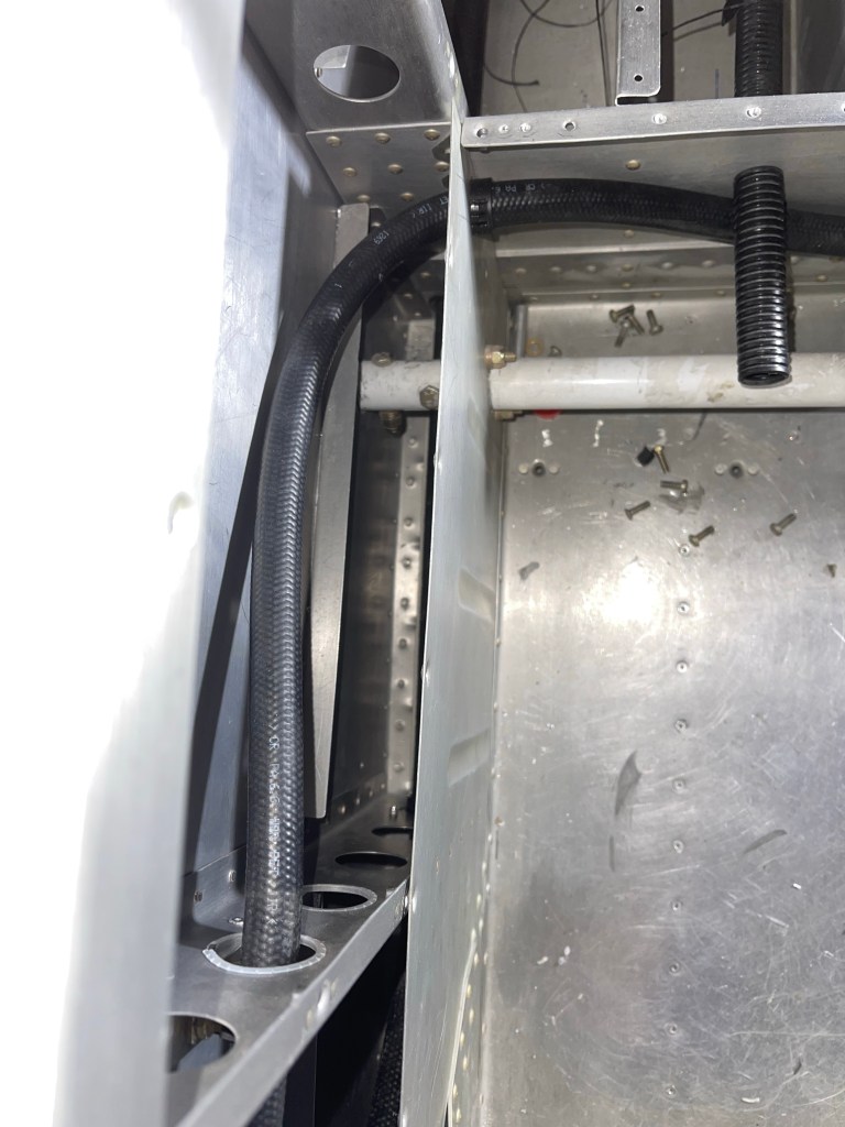 I utilized Adel clamps anchored to the step to route the hose inward and keep it away from the bolt holding the step in place. It then makes its way aft to the tailcone.