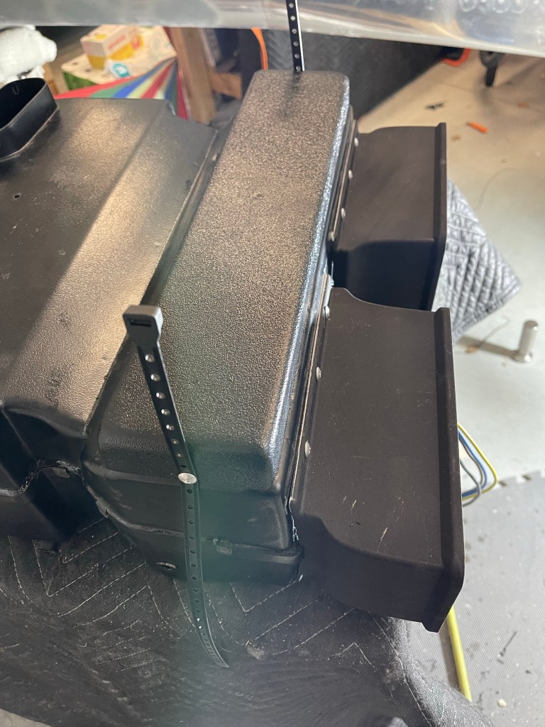 I also took some time to fabricate some hinged access doors to get to the AC connections under the rear seats in the first bay. These will secure down using the 2 existing screw locations on the rib. These connections are for the AC condenser.