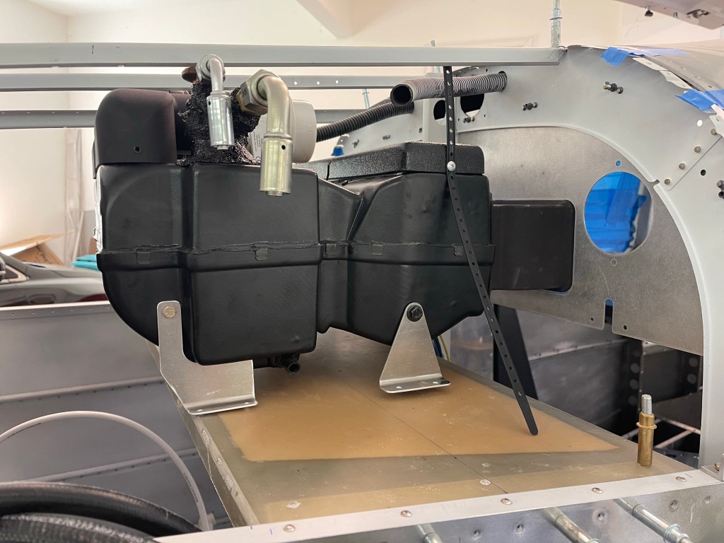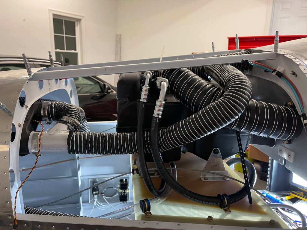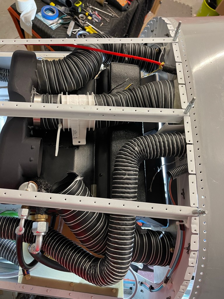 Finally a view from the left side showing the fresh air connections from either side to the NACA vent controller to a single 2″ duct. Here you can also see the evaporator condensation drain in place, but not riveted yet to the belly of the plane.