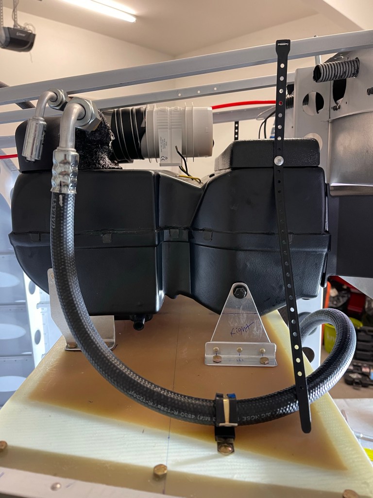 Below are the 99% complete pics of the evaporator and all the associated hoses. I did use an AN3 blot with some tubing as a standoff and an adel clamp near the rear of the shelf to hold the seat belt cable up so it wouldn’t fall downward and rub against the hoses.
