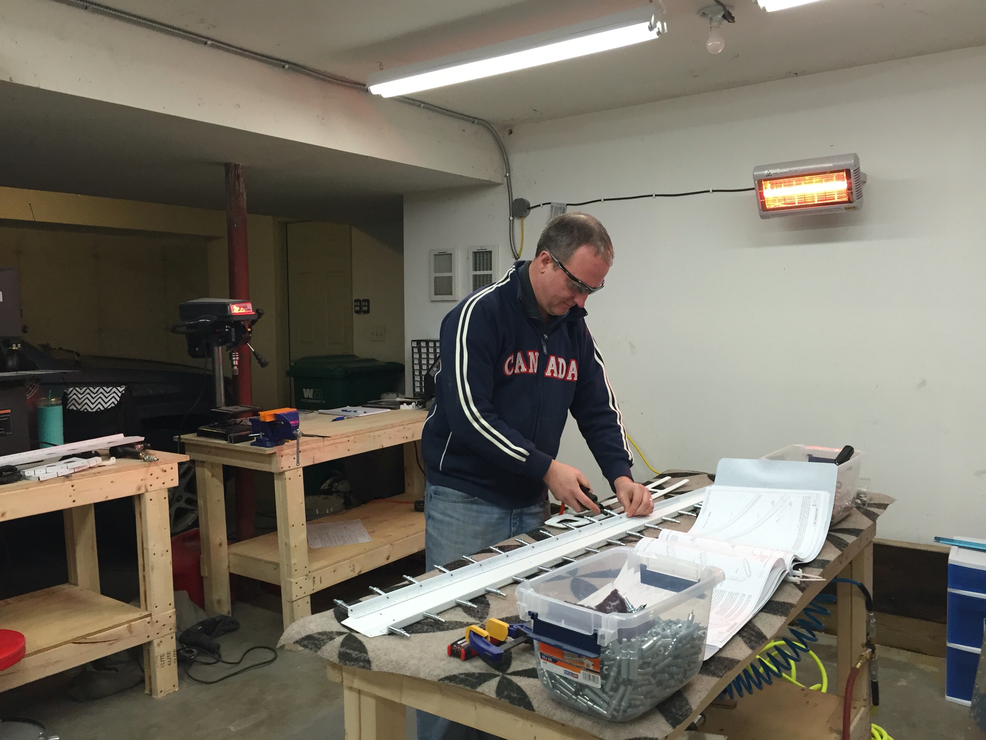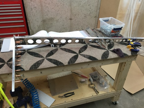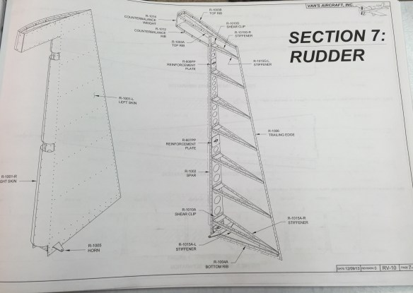 The next step was to assemble the spar, doubler, stiffener plate, and the remaining rudder hinges. Here I am doing that step.