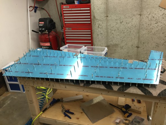 Stringers riveted together to the previous picture and Cleko’ed to the front spar