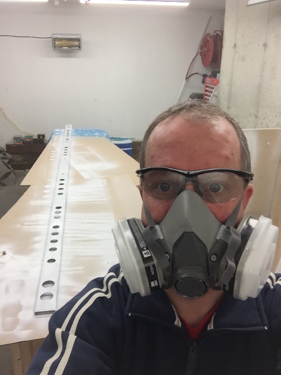 A quick “selfie” in my garb after finishing the primer coat on the Horizontal Stabilizer Rear Spar.