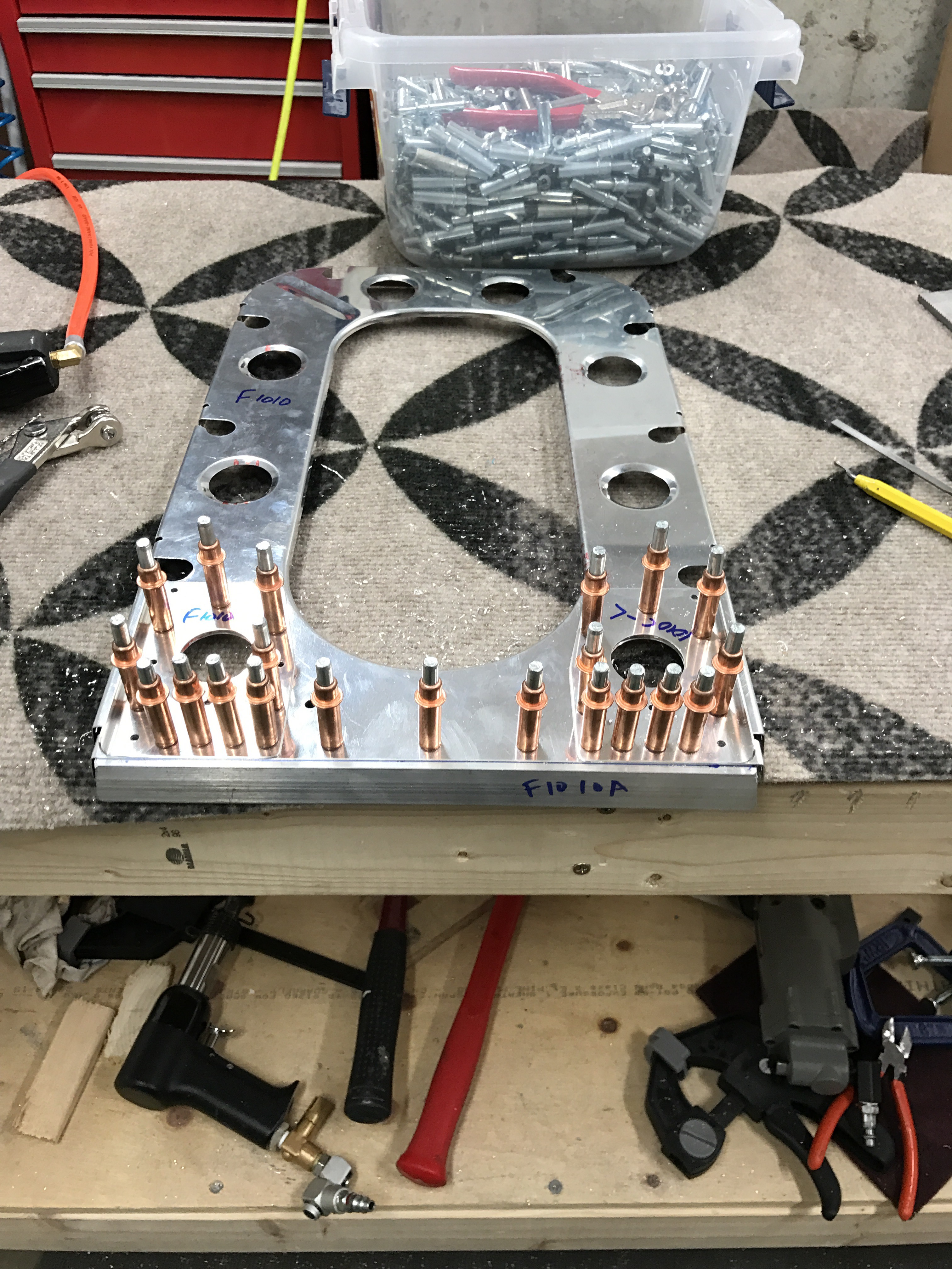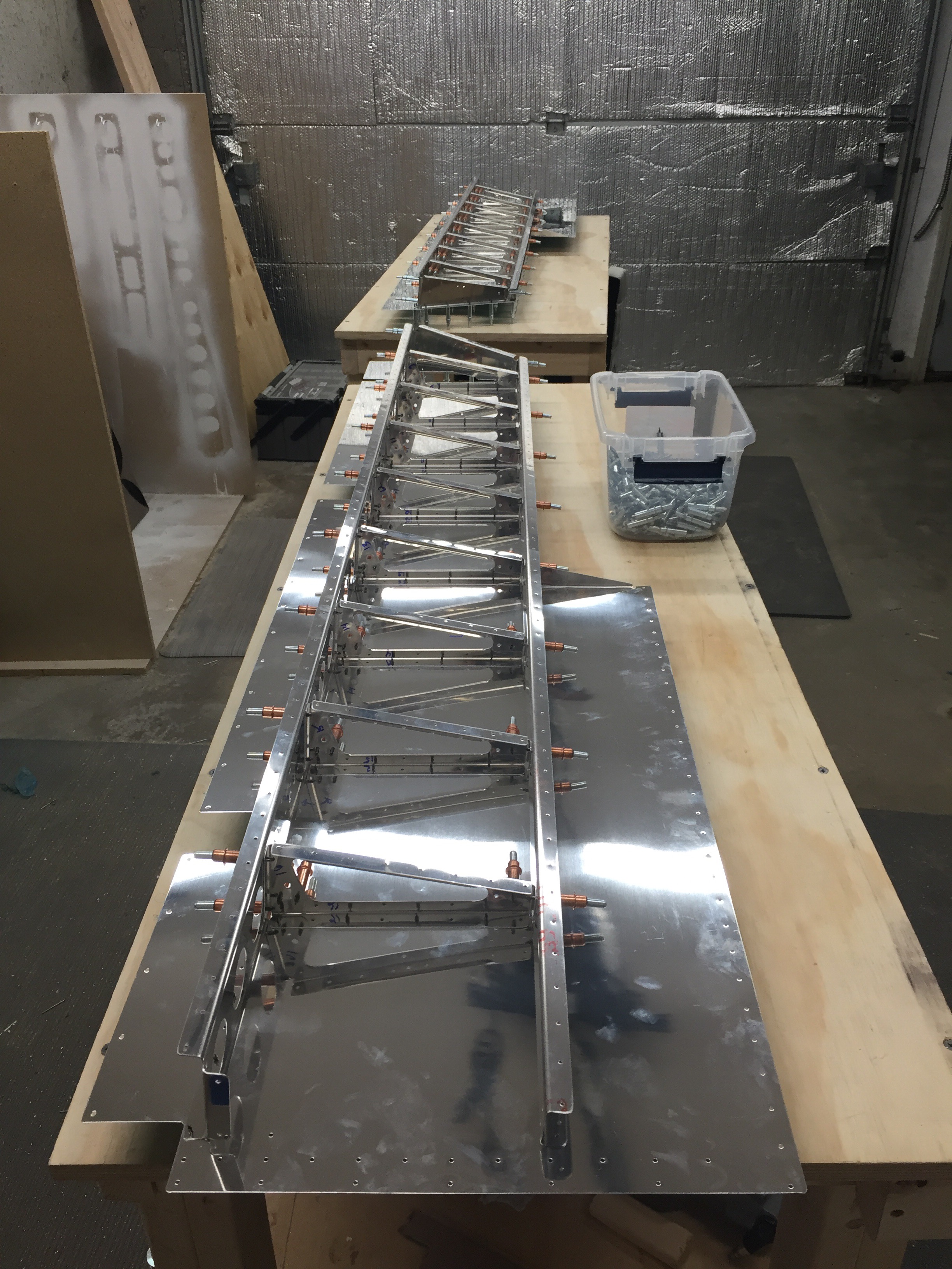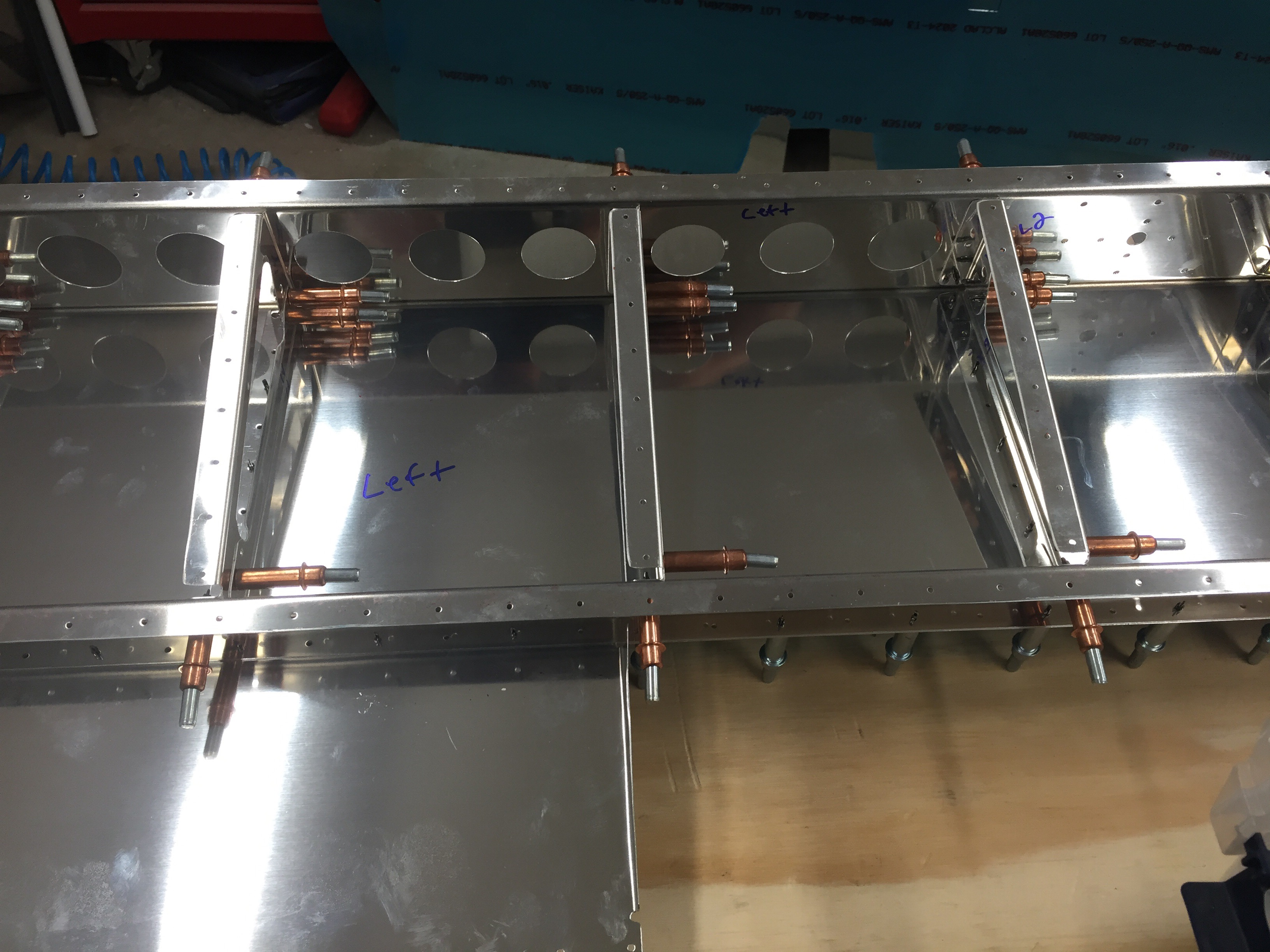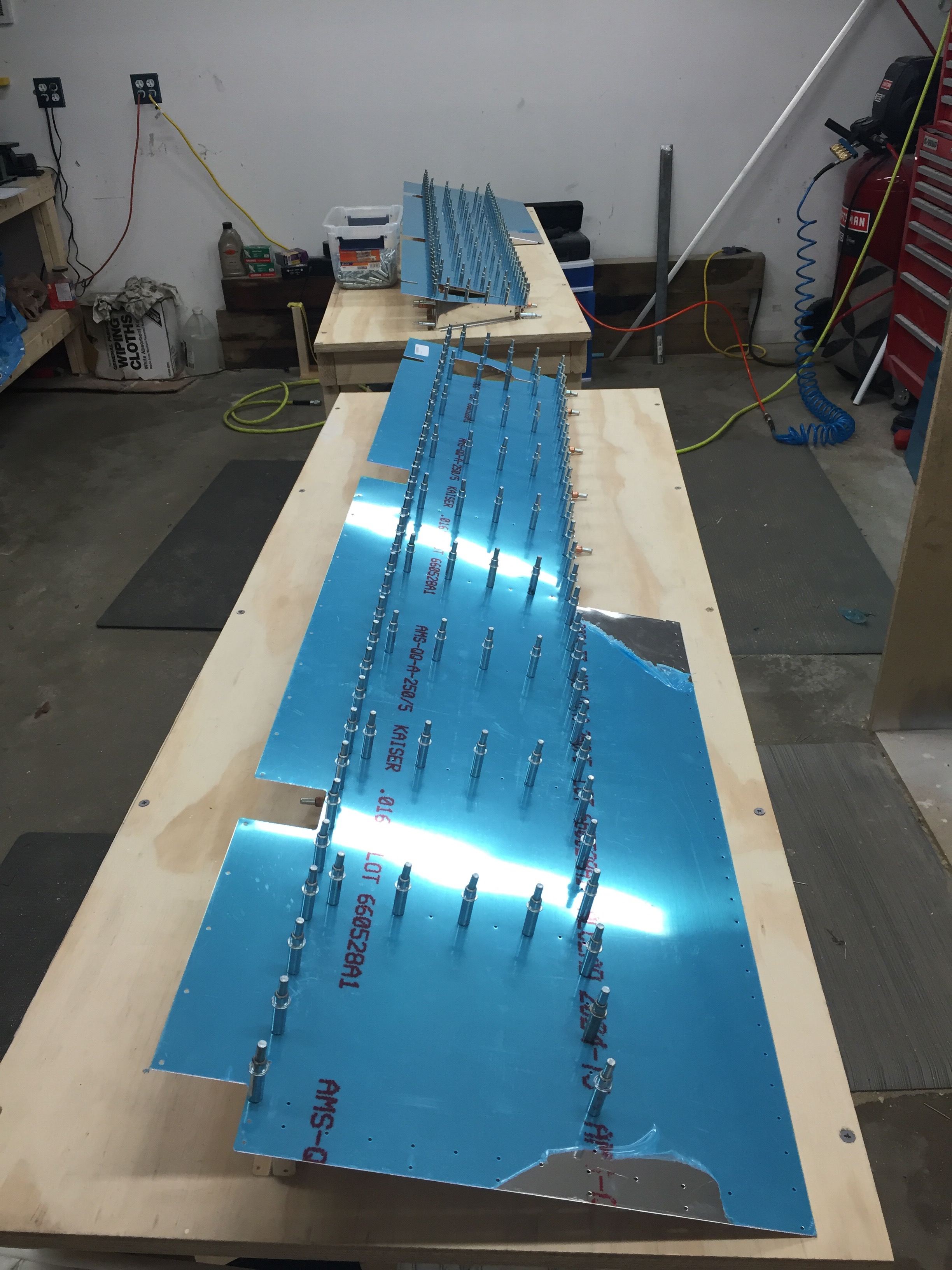Various pictures of initial riveting of the spar and spar stiffeners, trim access stiffener and nutplates, stiffeners back-riveted to the skins, and pop riveting the ribs in some tight quarters.