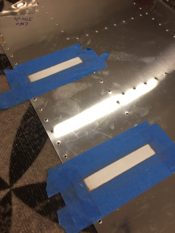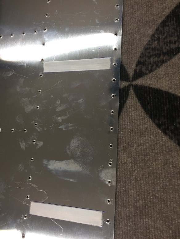 So today, I dimpled any 1/8″ holes and did all the countersinking needed to some holes on the top of the rear spars and the trailing edge wedges. I also prepped the skins for the foam ribs used on the trailing edges by marking their positions and snuffing up the metal with sandpaper for better adhesion.