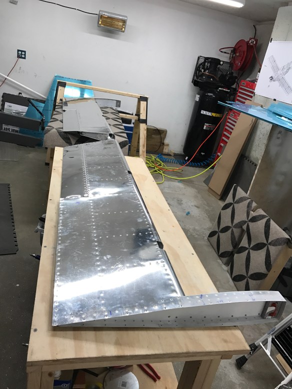 The elevators are done with the exception of the trim tabs… Well the first iteration of the trim tabs anyways. The main mistake I made on the trim tabs was bending the close-out tabs on the end too close to the reliefs in the skins. I misread the directions and thought I was supposed to put the supporting wooden blocks 1/32″ to the inside, when really it was in the opposite direction. The end result is some bulging as you approach the ends of the tabs because the tabs are too long. Not real terrible, but I’m just not happy with how they came out. So parts are on order to build new ones, which won’t take more than a few hours to complete.