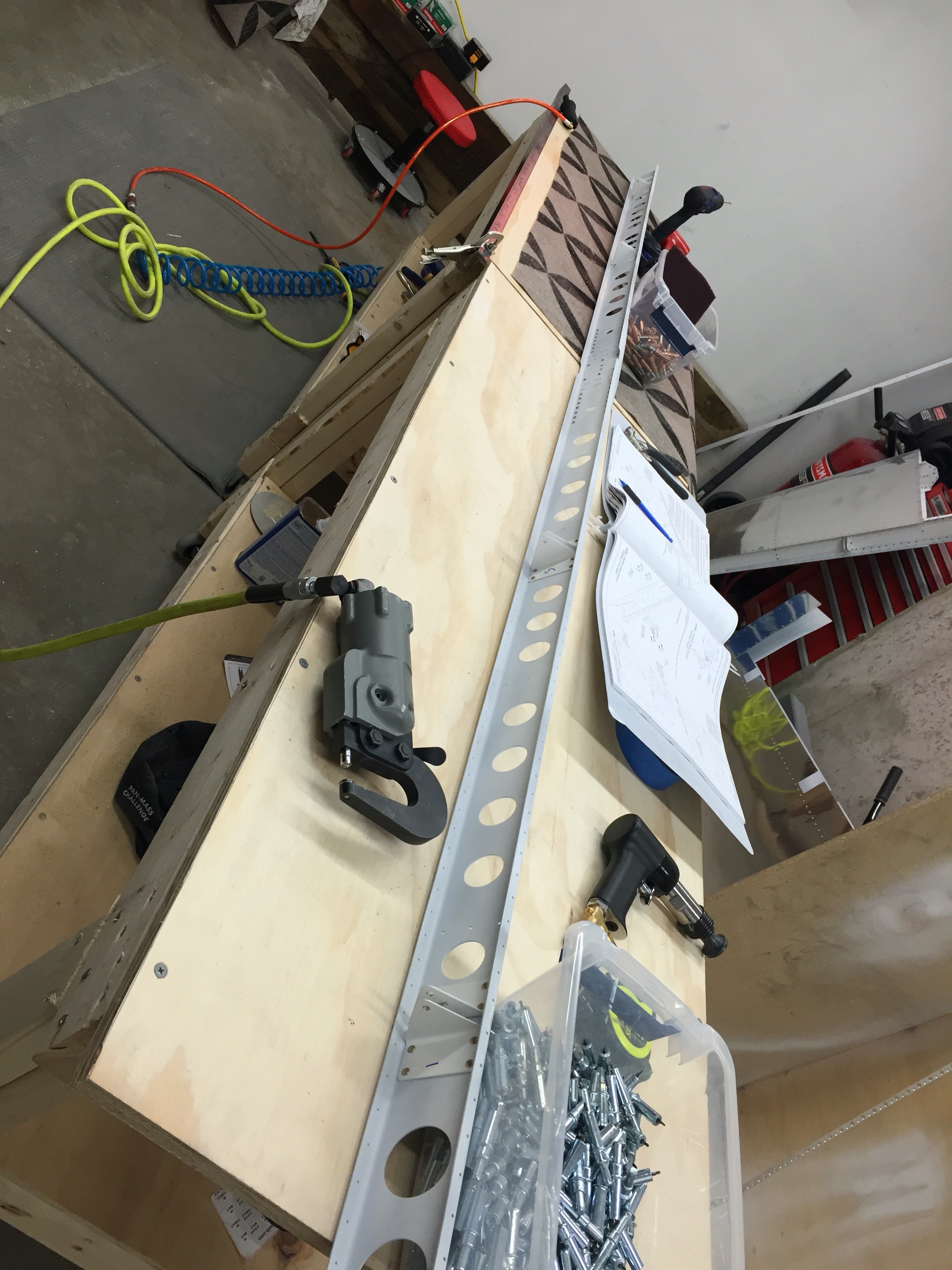 Also, while riveting the front spar, I managed to trip over my air line and pull my squeezer off of the bench onto the floor. The result was the trigger pin jammed in the on position…