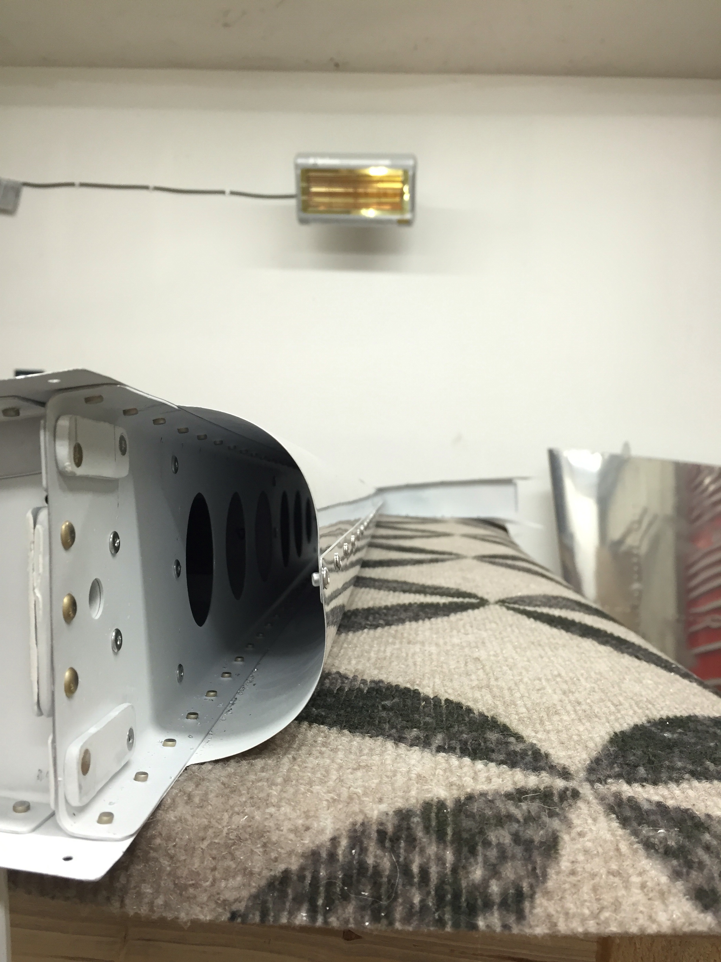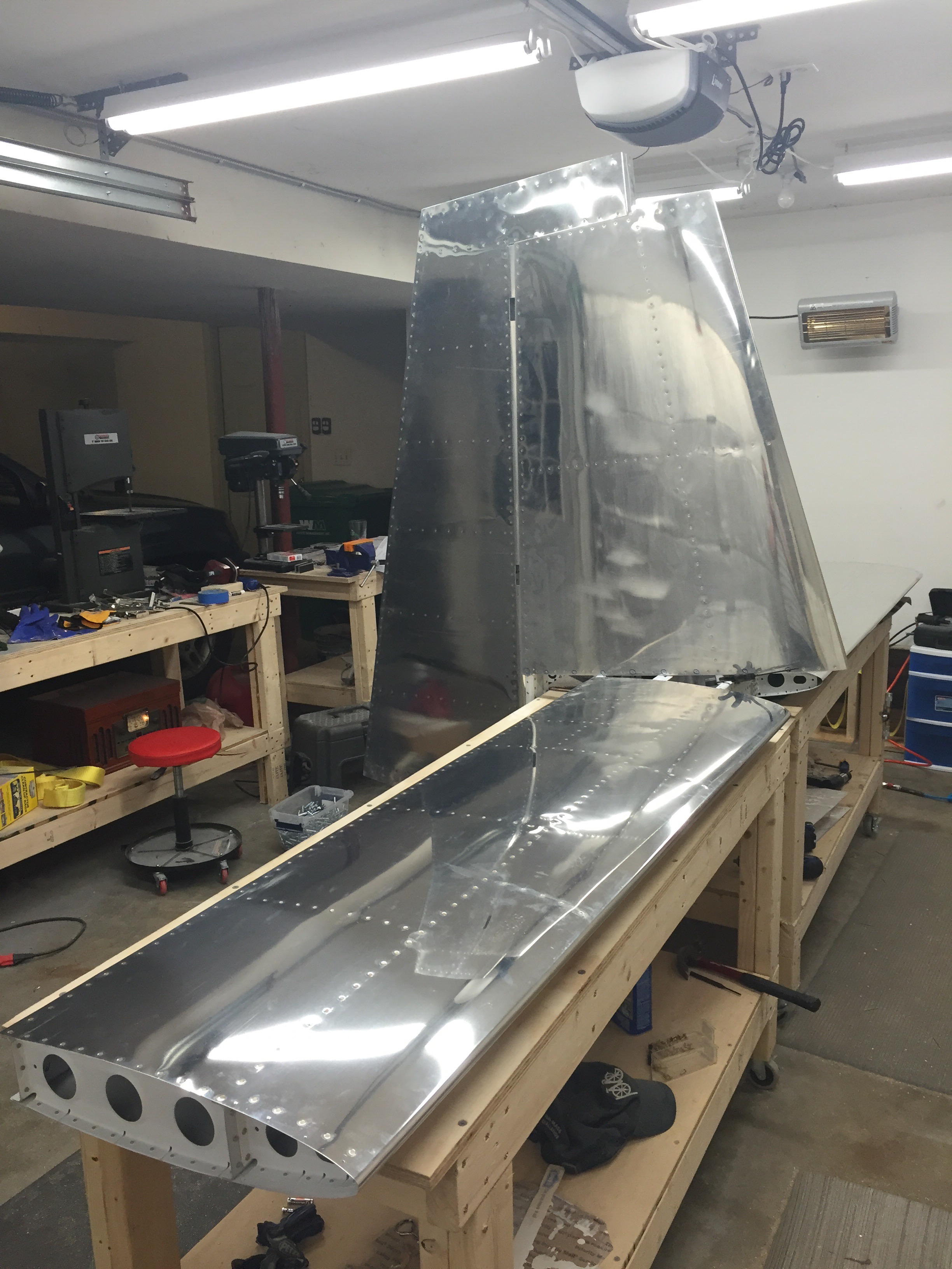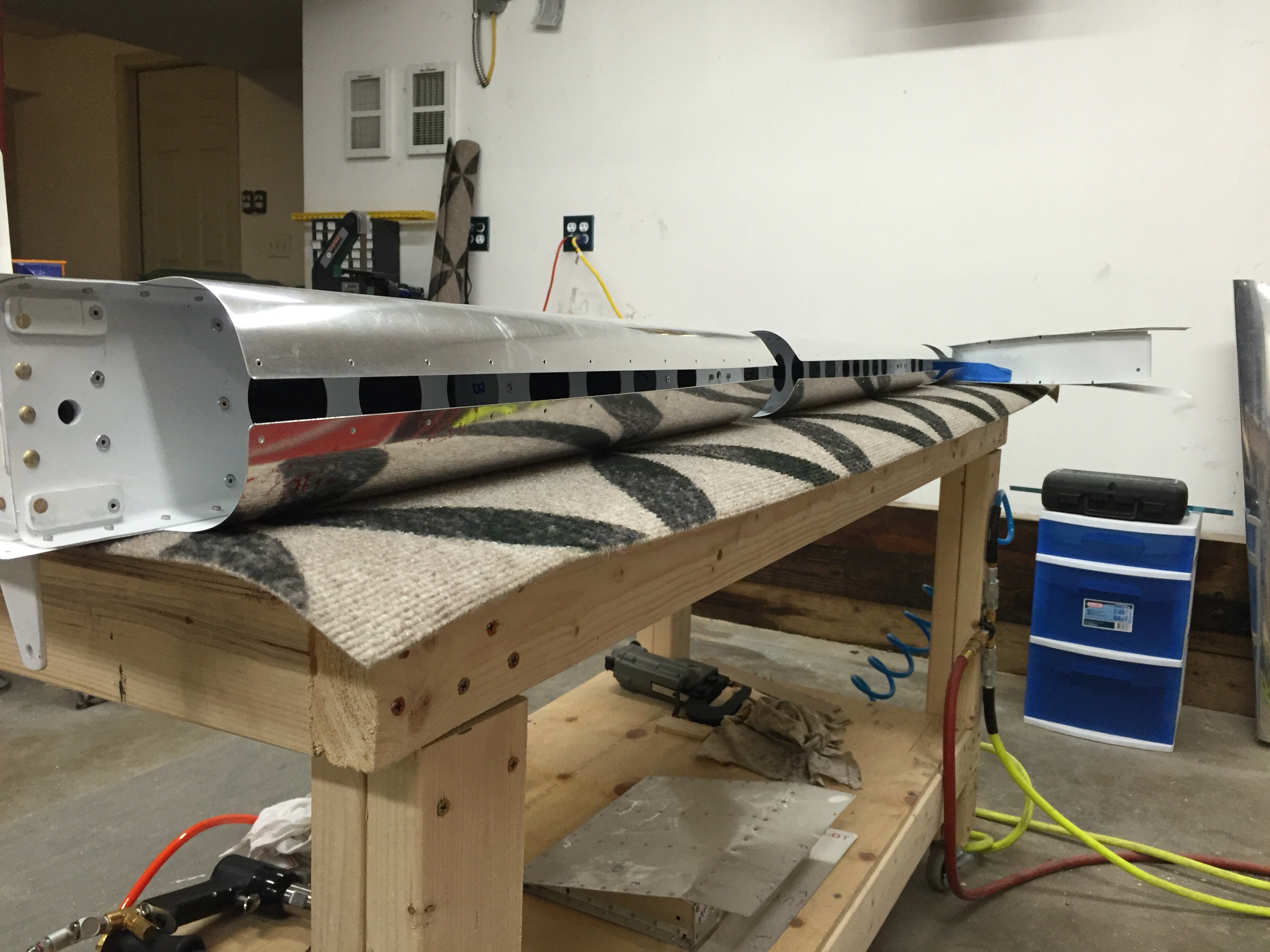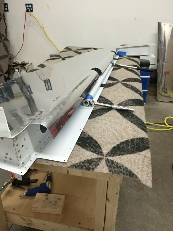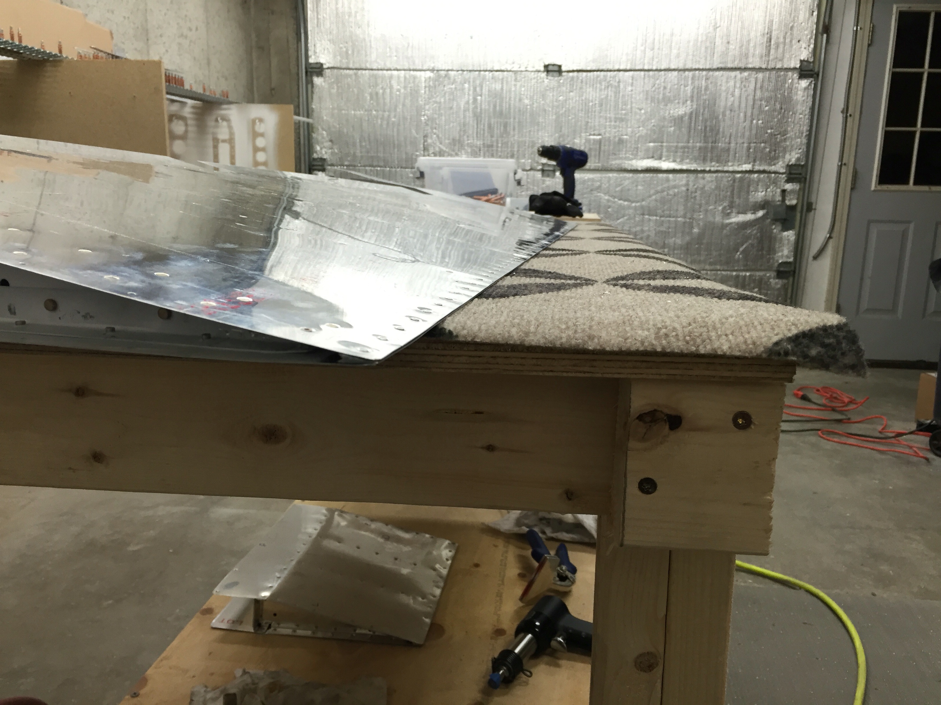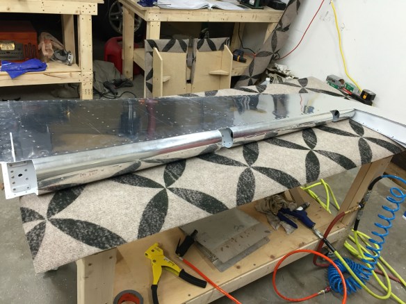 The last 2 nights I spent rolling and riveting the leading edges, installing the counterbalance weight, and finishing the last few rivets on the front of the skins.
