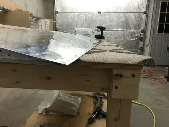 The 3M VHB tape from Van’s showed up this week, so I was ready to start back on the rudder again. Thankfully, this time the tape VAN’s sent worked like a charm. This further validated that the tape I got from Amazon was junk. The night that the tape came in, I adhered it to the trailing edge wedge piece. Tonight I attached the wedge to the right skin which sits flat on the table. Clekos were installed from the underside of the skin in the trailing edge at the end of each stiffener. I then got my wife to help me as we rolled the left skin onto the right skin, stopping at each stiffener location to finish the internal riveting of the stiffeners and shear clips, peeling back the 3M tape on the top of the wedge piece as we went. Once this was done, I finished riveting the lower rib to the skin, and installed clekos in the rest of the holes of the trailing edge in an alternating fashion. I clamped a 6′ steel angle to the edge of the table to give a straight and uniform edge. Finally, I put a wide board over the skin with some weights on it to hold it down and let the surfaces bond to each other. I’ll leave it overnight like this. Good progress tonight!