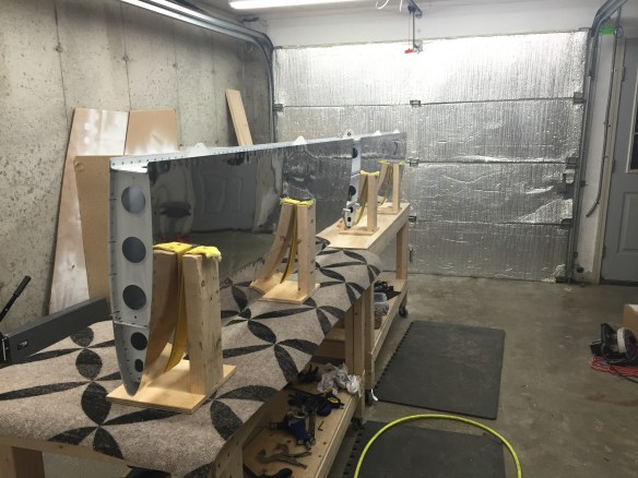 Stringers riveted together to the previous picture and Cleko’ed to the front spar