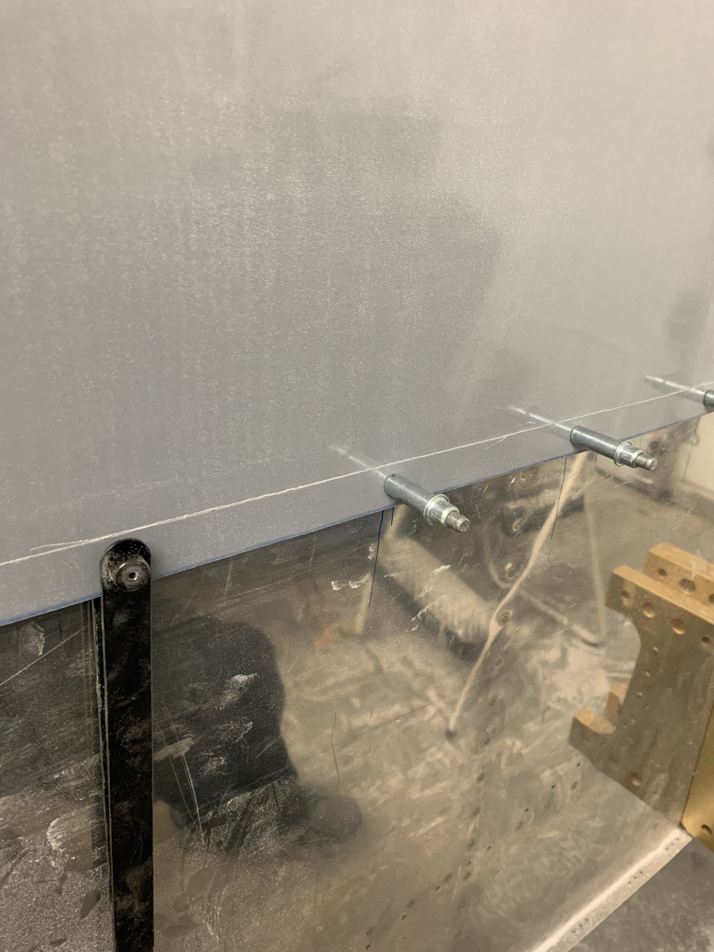 Once the door latch mechanism was back in and installed it was time to drill holes into the door frames to accept the pins and keep the door closed. I went against the plans of using a bolt ground down to a point to mark the spot where the pin comes out and instead used a method I saw on Dr. Mark’s build and using some math. I first marked the top and bottom of the door skin where the pin comes out. Then transferred that to the fuselage and used a square to further transfer those marks to the inside door edge.