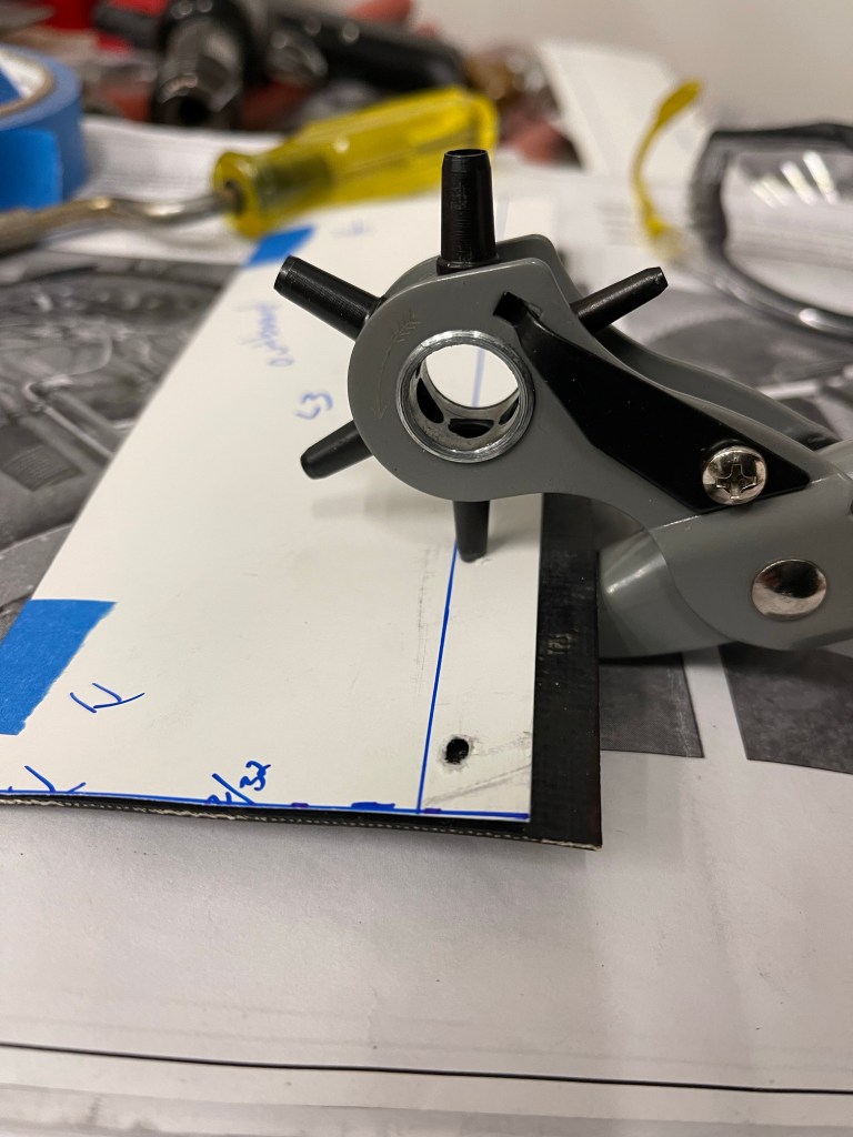 I then used the previously drawn line to place the template/piece assembly in place relative to the metal baffle making sure I had enough material for the overlap spots to the adjacent piece. I would use a drill to cut away the construction paper enough to mark the spot of the hole to be punched. I did the first 2 holes, then punched holes.. put the piece back into place with clecos and then drilled the remainder of the holes so I didn’t have to try to hold the assembly in position for the entire sequence.