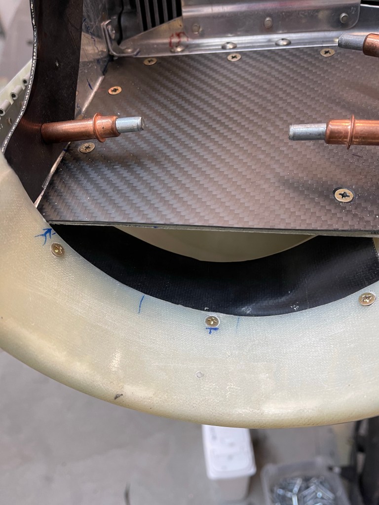 Below is a picture of the iniital test fit of this strip/baffle material fit. It seals up the small gap between the cowling and the intake tubes by resting on the inside of the air intake tube. I’ll likely trim this piece a little more for a better fit. Note also that I was sort of holding this in position to take a picture so the alignment is a little off, but you get the gist of what I am trying to accomplish here.