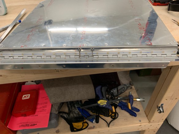 Measuring the door hinge pins. I followed what Ed Krantz did with the baggage door hinge and making it flush to the skin. This required cutting about 1/4th of the inner part of the eyelets out in the center in order to slide the pins in from the center. The plans have the hinge proud of the skins and you slide the pin in from outside.