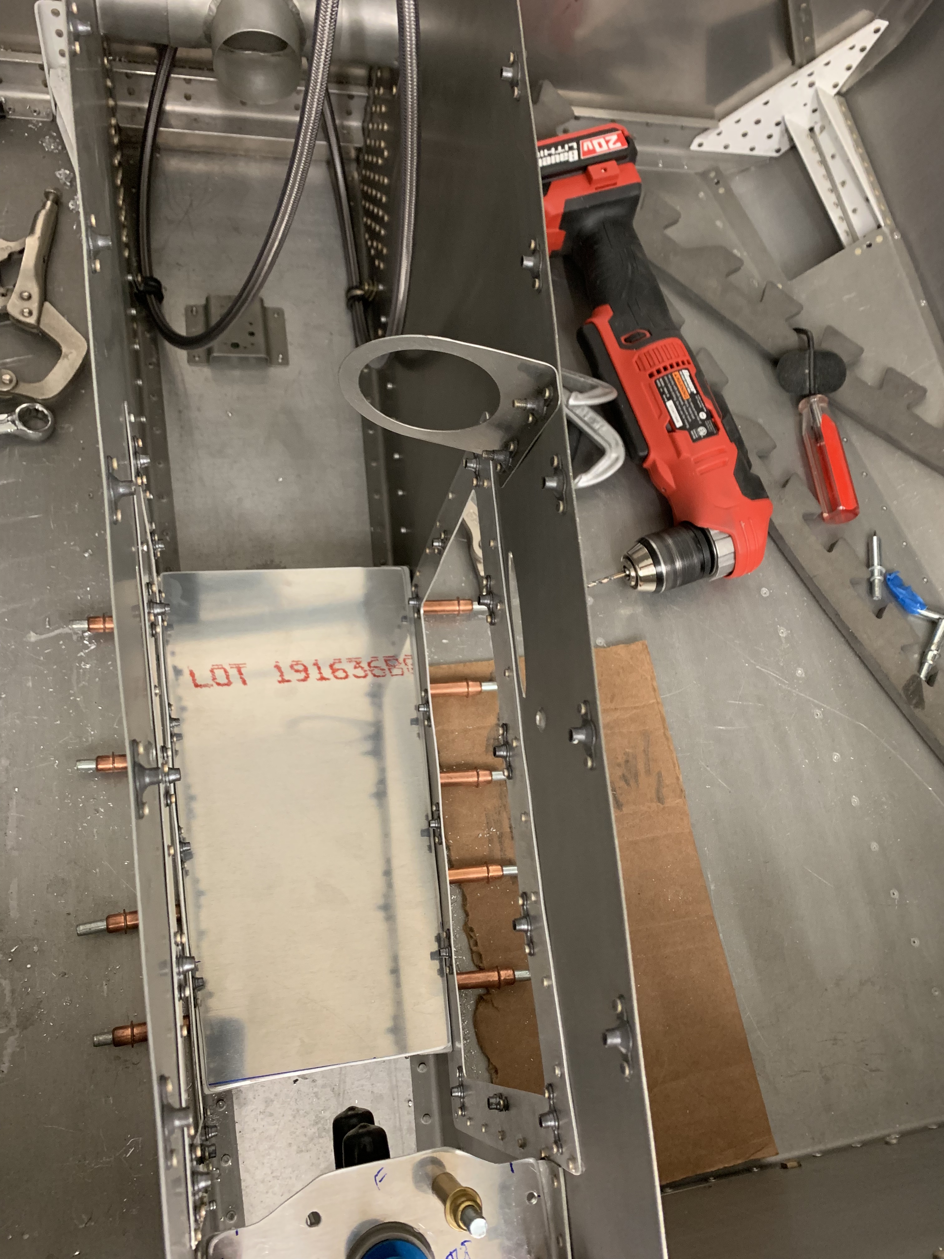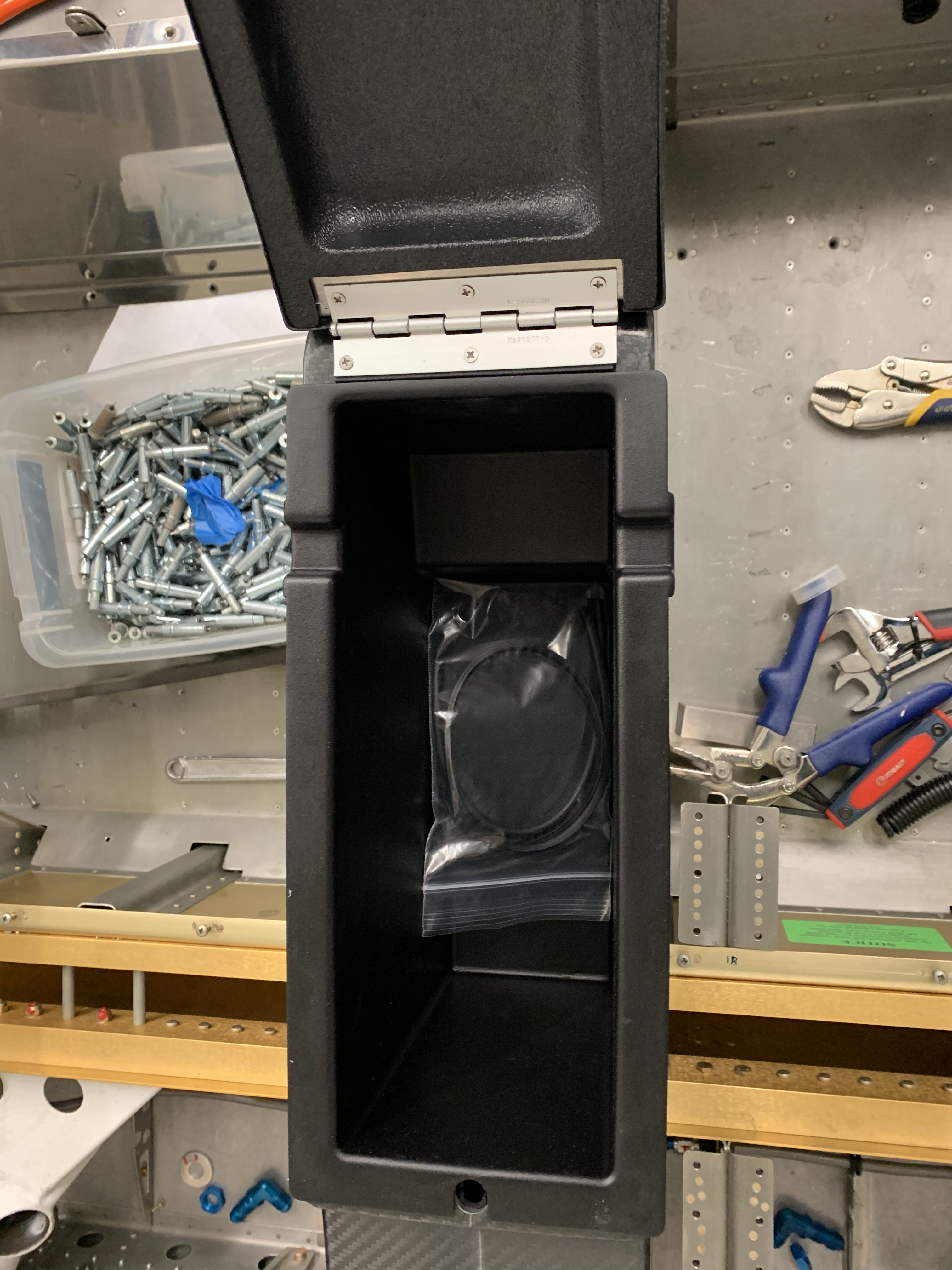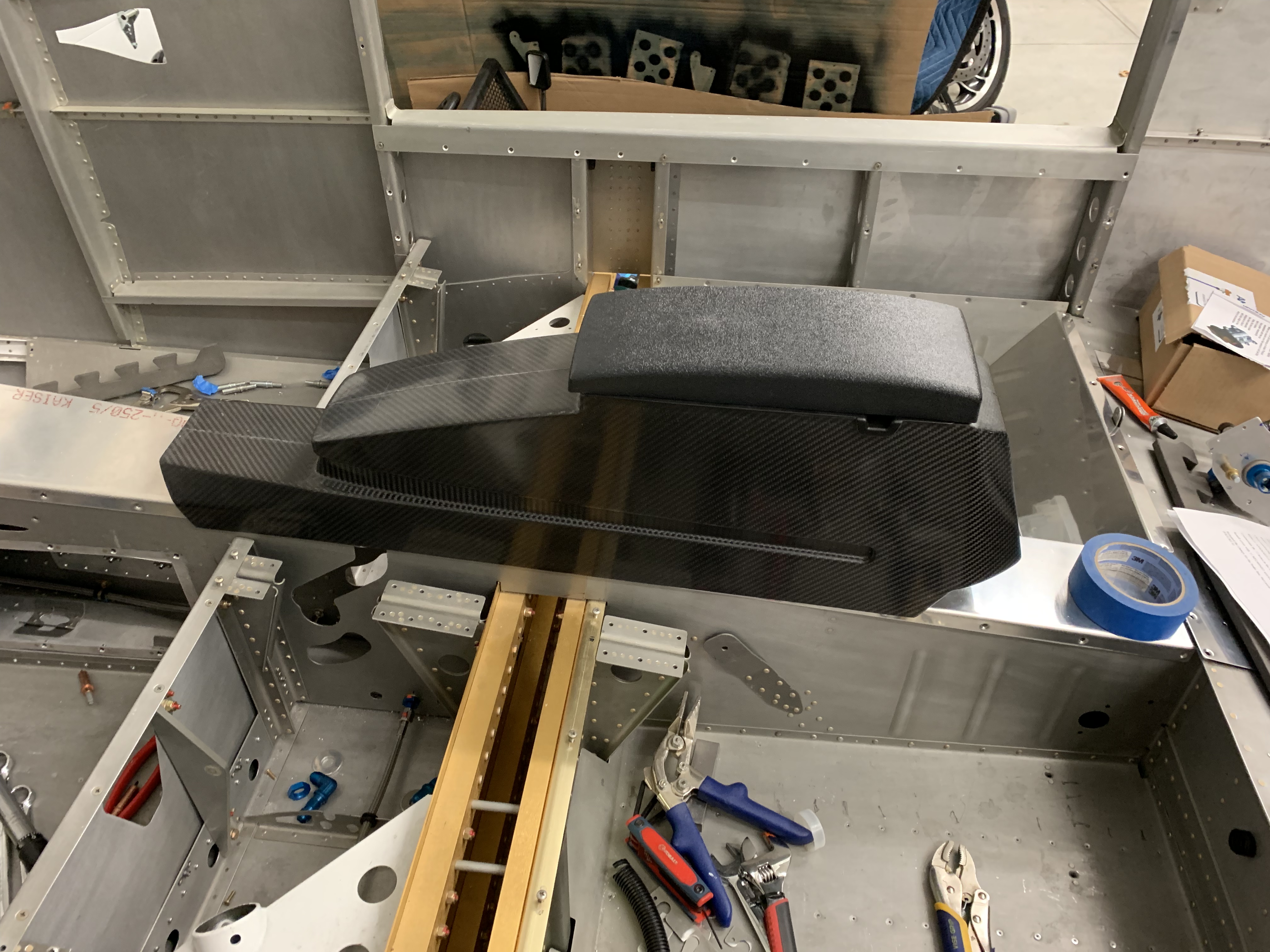 I first mounted the lower instrument panel console and got it match drilled to the left side panel. The same was done to the right side panel. I used a strap duplicator to match drill holes into the side panels along the top of the tunnel so we can secure them to the existing hole/nutplate locations. Once that was done, I located the center armrest into position and matched drilled 6 holes (3 per side) also to the existing screw holes on the top of the tunnel.