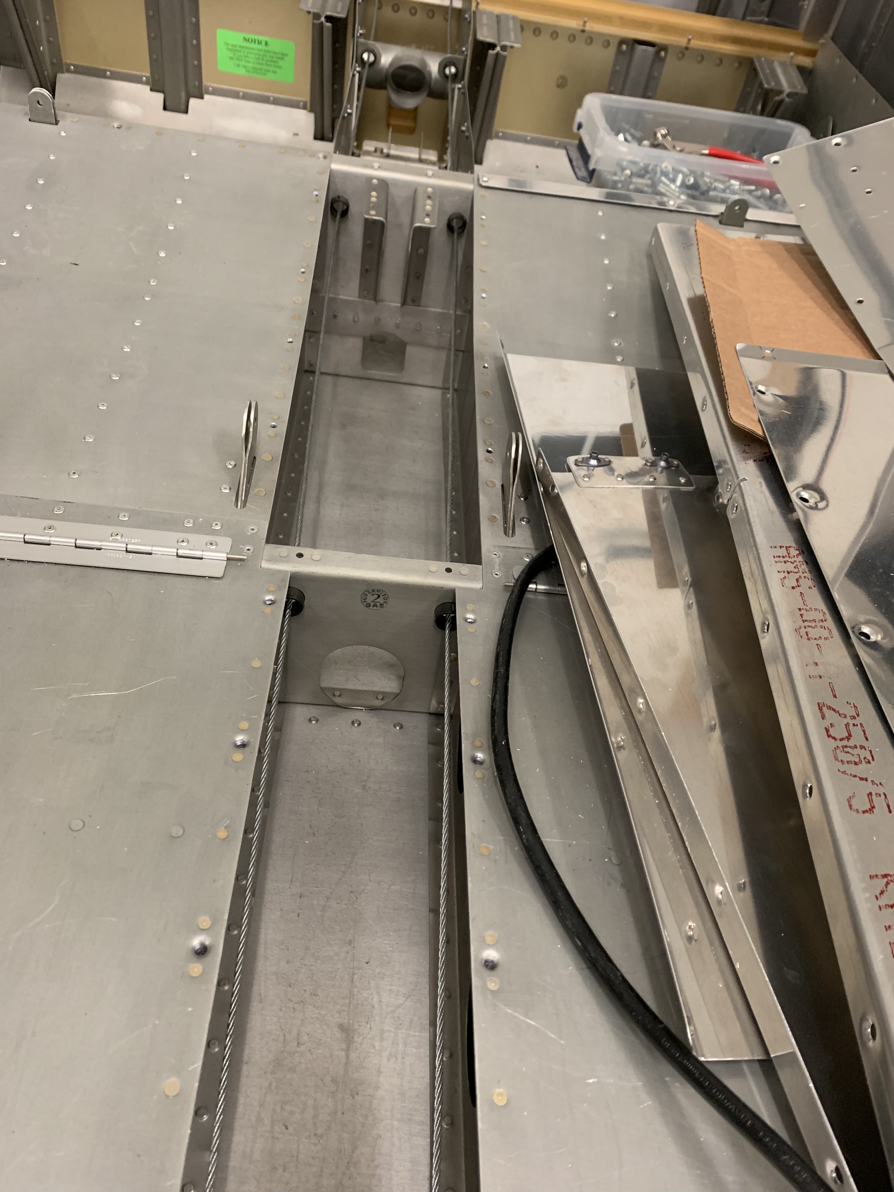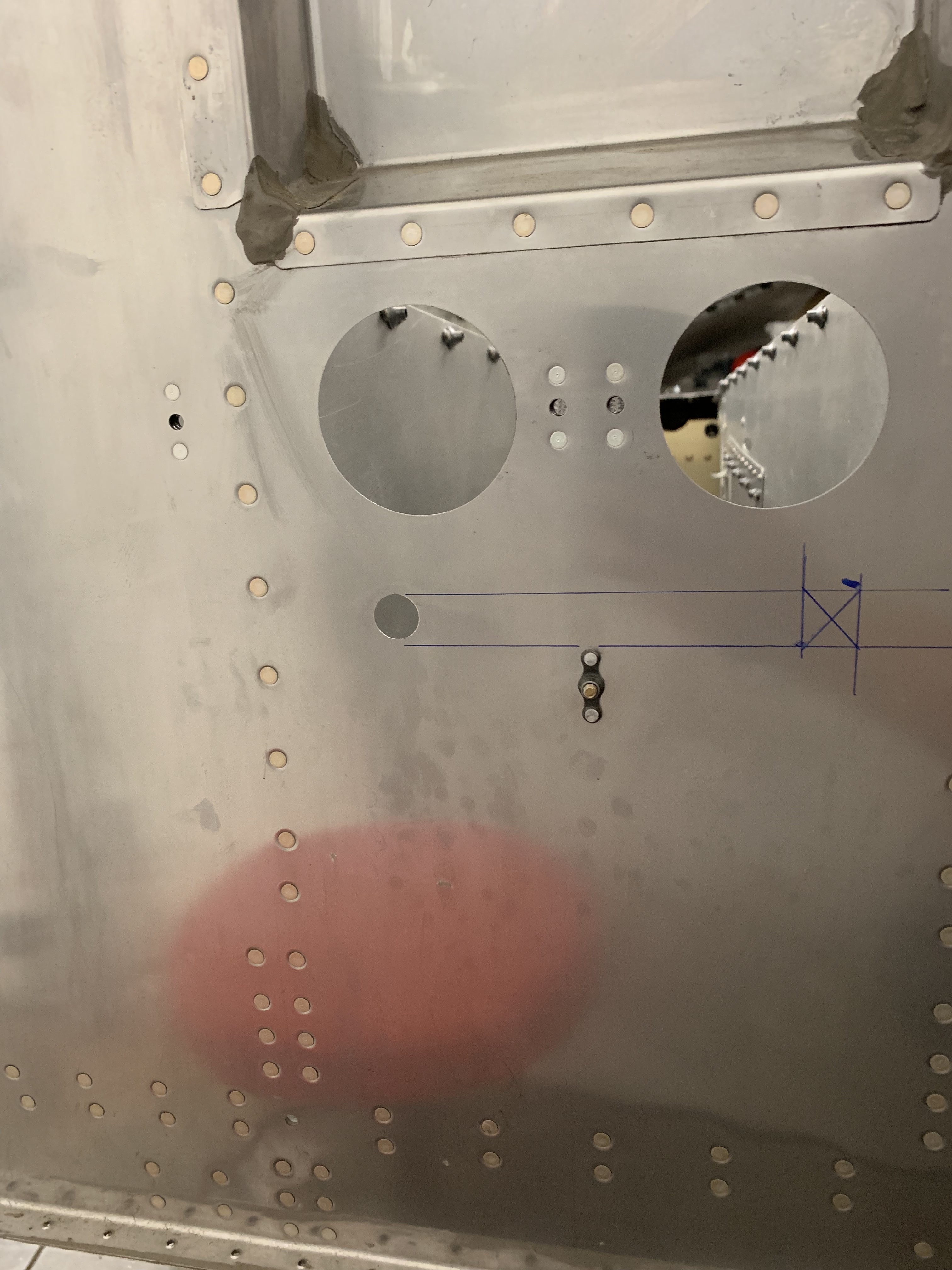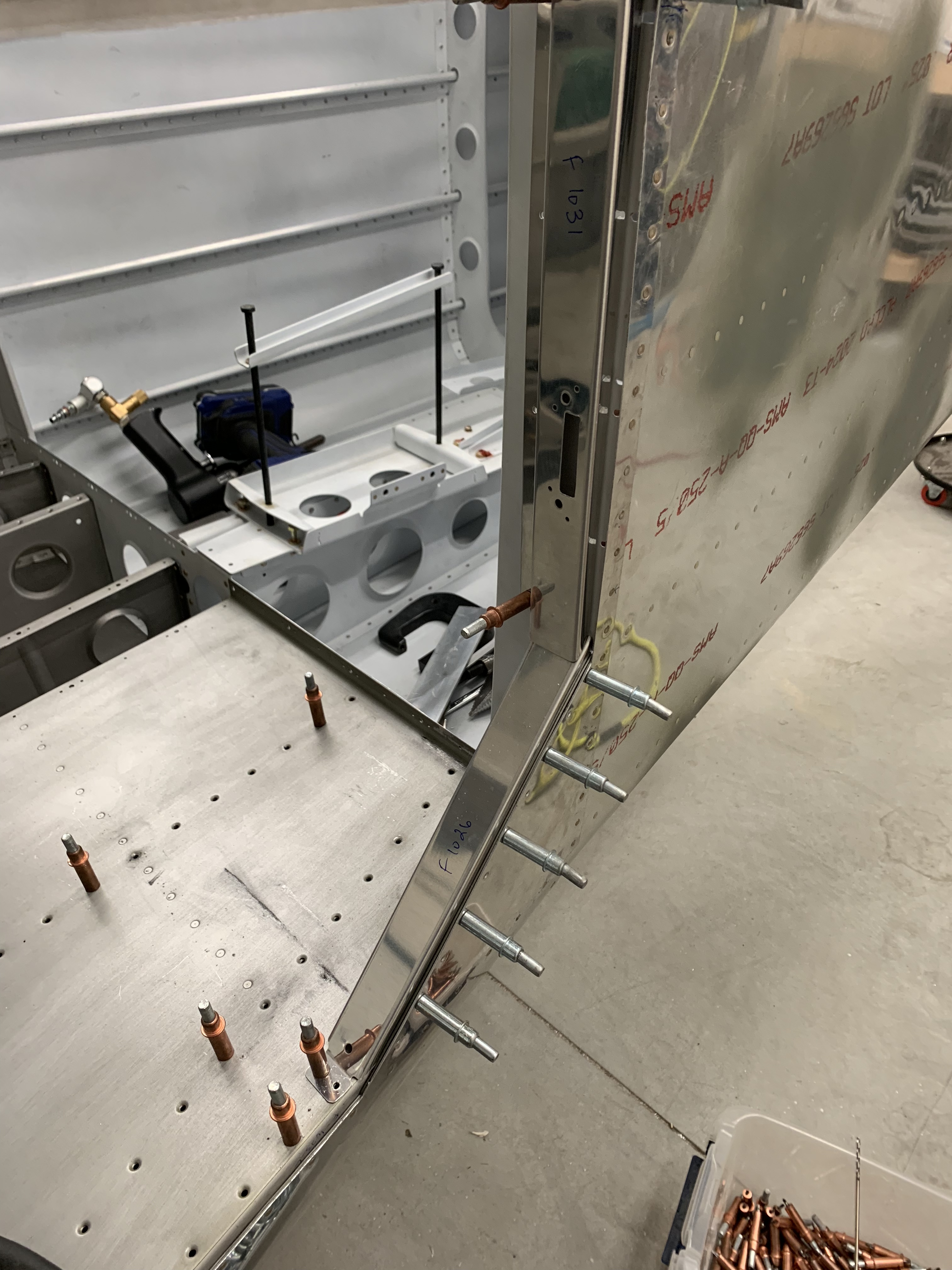 I first mounted the lower instrument panel console and got it match drilled to the left side panel. The same was done to the right side panel. I used a strap duplicator to match drill holes into the side panels along the top of the tunnel so we can secure them to the existing hole/nutplate locations. Once that was done, I located the center armrest into position and matched drilled 6 holes (3 per side) also to the existing screw holes on the top of the tunnel.