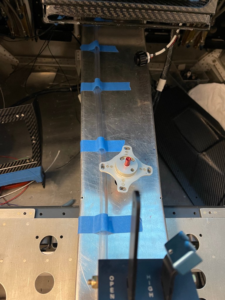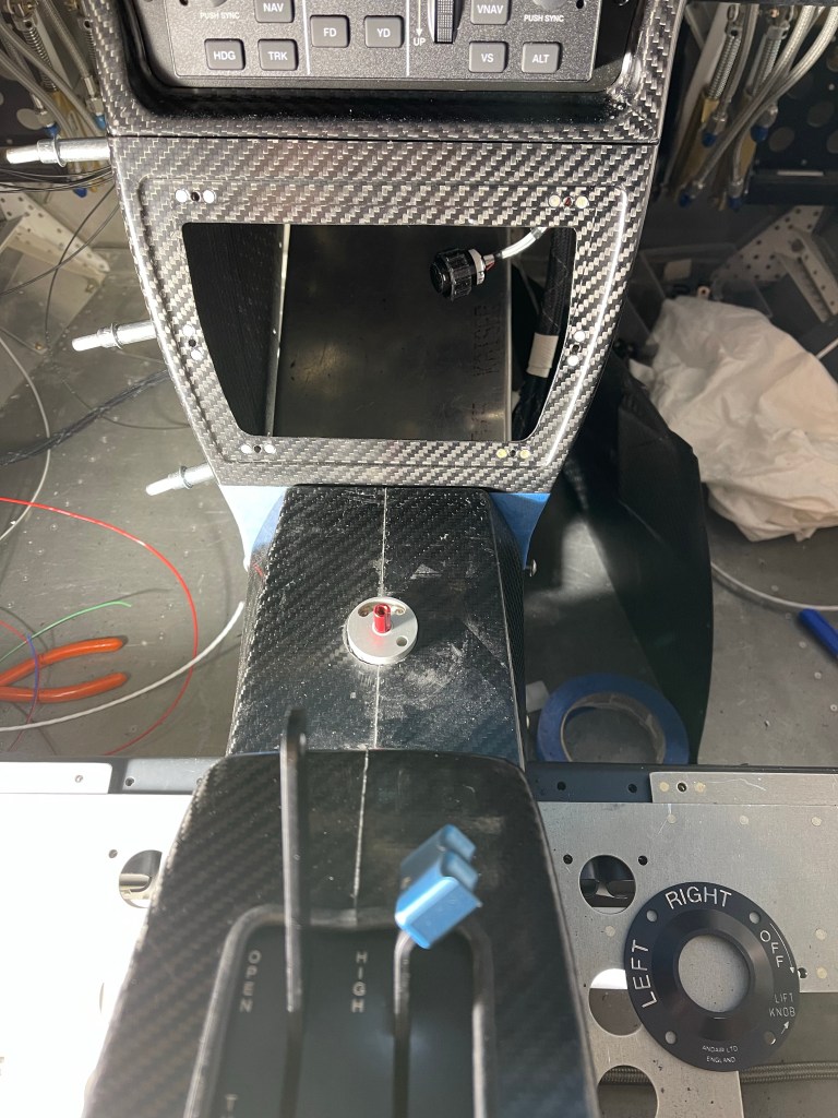 Once that was done, I had previously placed the Andair selector valve more or less in the stock location. So I drilled the hole provided by Van’s up to 3/4″ round hole for the Andair extension arm to come up through the tunnel cover. The extension was pretty close to centered on that hole, so I left it as is.. I used that hole in the tunnel cover to locate and drill the hole in the carbon armrest for the selector.
