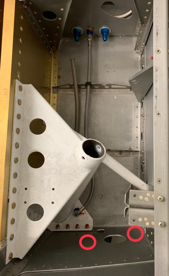 The following picture I stole from another builder. It depicts the area in question. On top, is the side skin of the fuselage. Forward is on the left. Bottom is the fuel tank. Here you can see the hard fuel supply line coming out of the stock hole in the fuselage at the top, bending right and downward into the tank fitting. The red arrow indicates the approximate position of my return fitting on the tank. It’s just forward of the tank vent which has a red cap or tape on it in this picture just to the right of the arrow. One thing that I noticed is that if I were to drill a hole in the most-forward position indicated on the picture above, I might interfere with the aileron control rod or interfere with the tank attach bracket (the medal piece all the way to the left in the picture.) So I decided to keep it close to the supply line in a very similar spot as this builder did. His return line is the blue 90* AN fitting just above and behind the supply line.