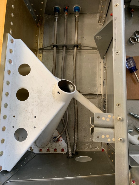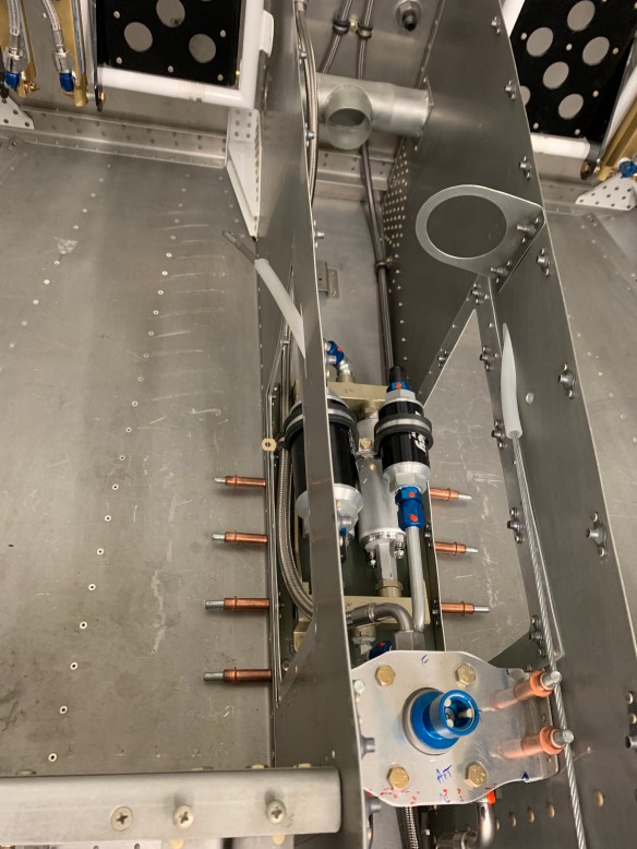 Below are the short supply (bottom chambers of the fuel valve) and return lines between the Andair valve and the tunnel bulkhead fittings. These must go downward and aft as the slots in the tunnel there are for the control sticks between the front seats.