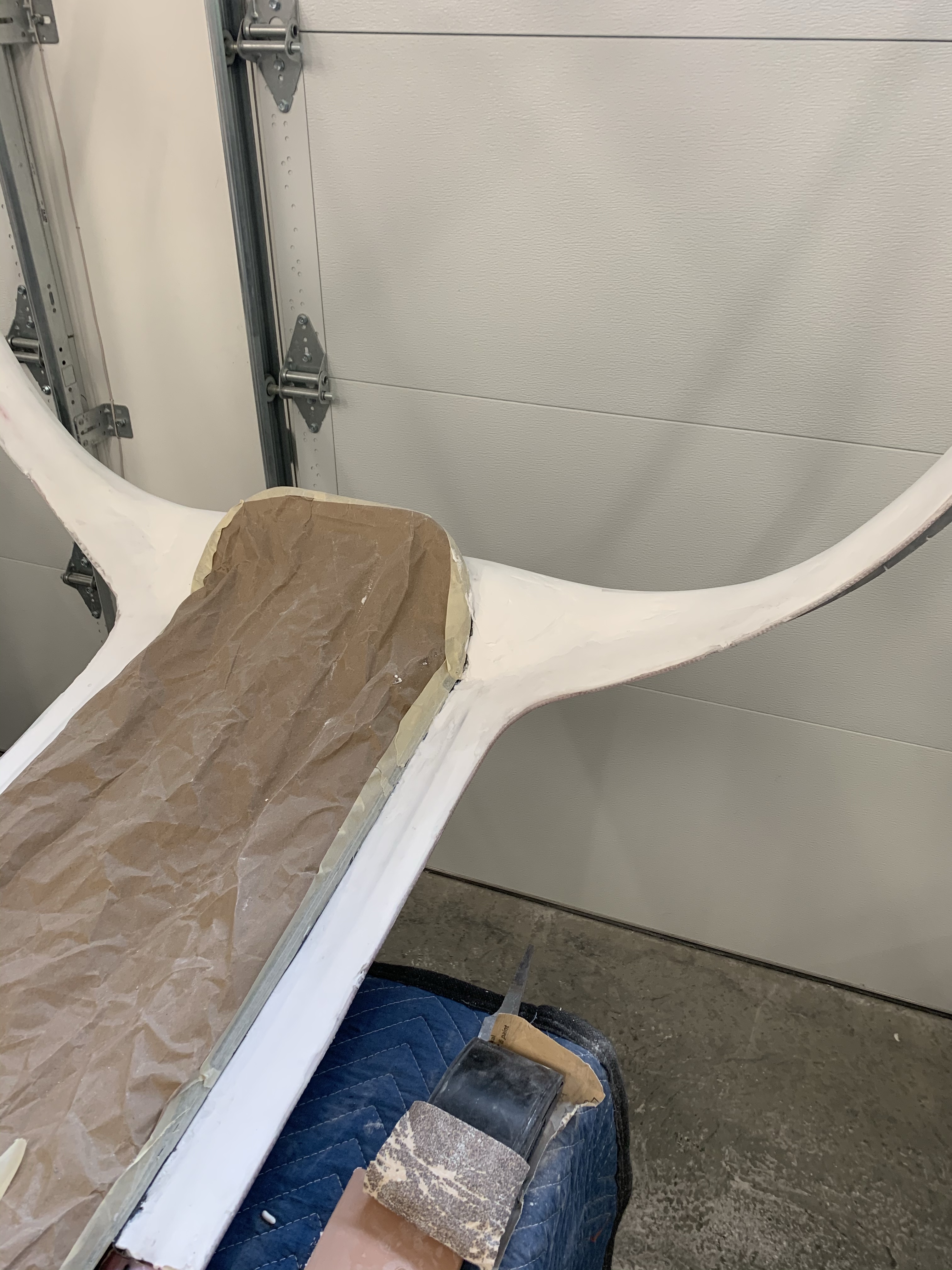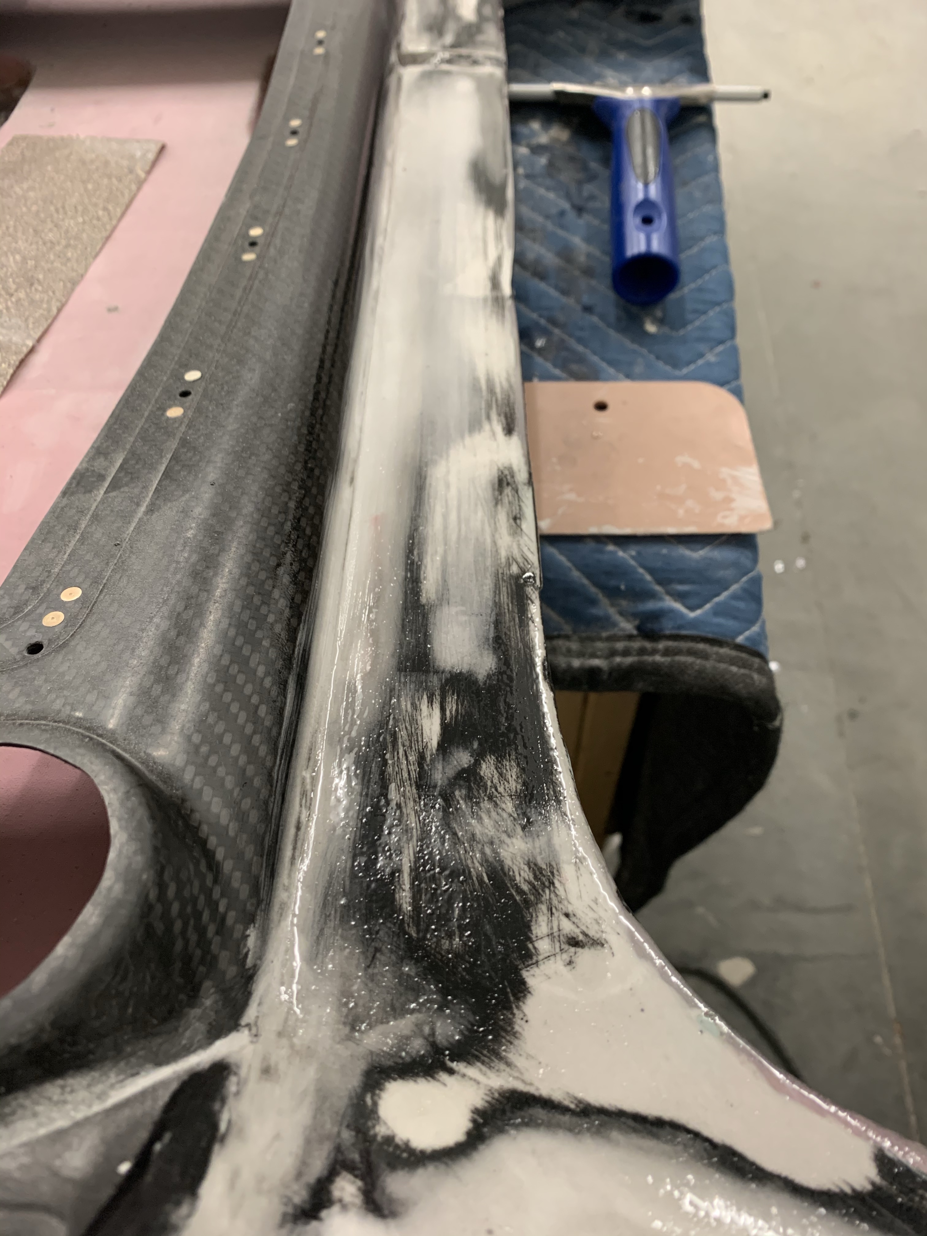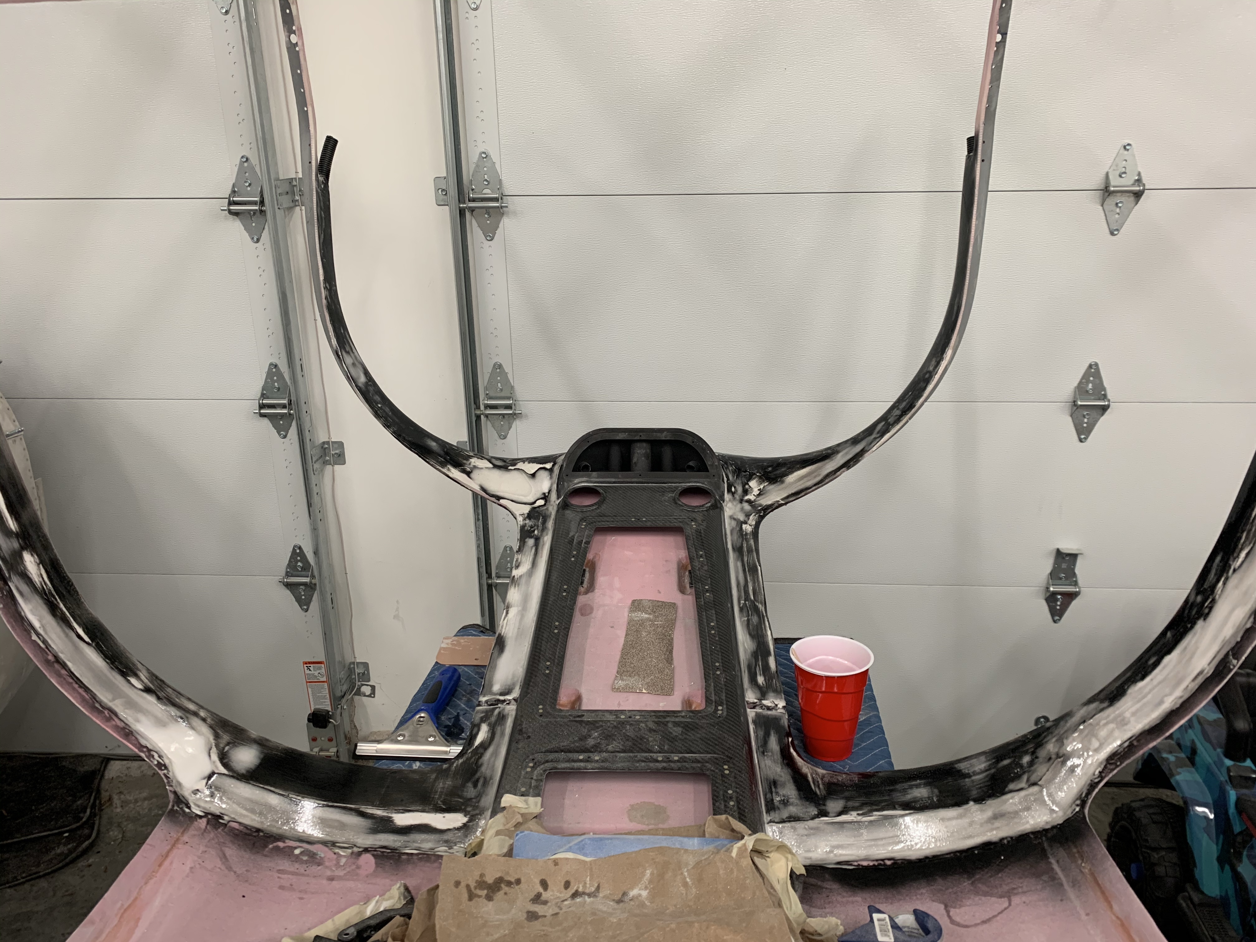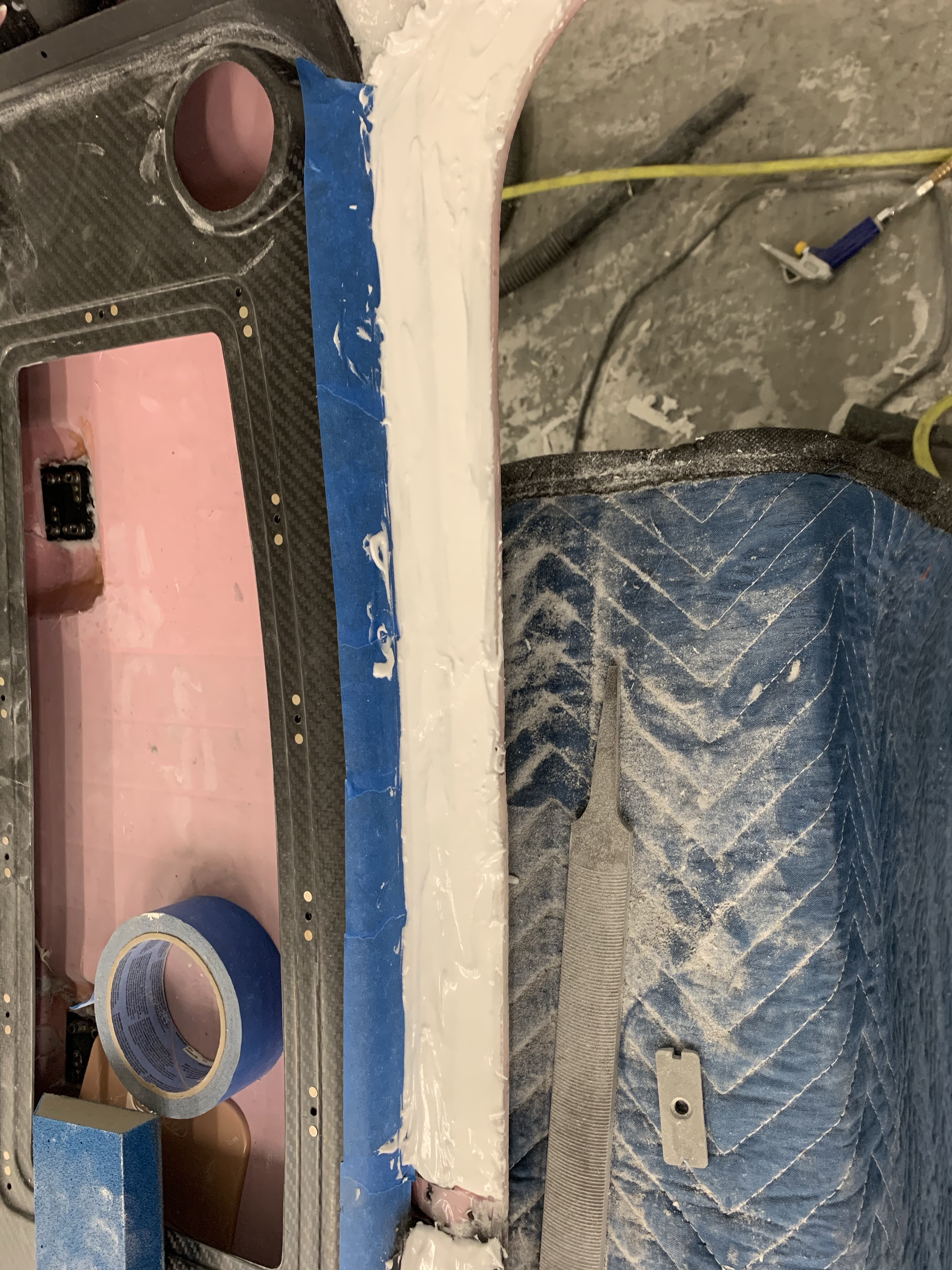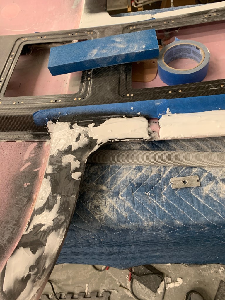 Then it was time to start filling in the surfaces that will be exposed and painted with filler. Initially I chose to use a polyester bondo material called Evercoat Rage Ultra. I did the vast majority of the right side with this.. I wasn’t really happy with it in the end. I found it difficult to mix properly and it did really stink the garage up really badly. I then tried using the more generally accepted epoxy and microballons as a filler on the left side. This seemed to go much better. I felt like I could mix it up properly and fairly consistently each time and it was easier to spread. I also doesn’t smell at all.. I’m sure most of my struggle with the bondo was inexperience and sticking with it probably would have gotten better, but I decided to forge ahead just using the micro. I spent the better part of 2-3 hours sanding off the bondo that I had put on the right side until I was down to pink again.. . I then spent several sessions of filling and sanding.. filling and sanding the micro over all the exposed areas. Through this process, I learned that it’s ideal to mix up enough for the whole job and spread more than you’ll need rather than doing multiple fill and sand sessions. The thought here is that you’ll never mix the epoxy and micro to the same ratio between batches and the 2 different mixtures have different densities making it hard to sand well. So far I haven’t found it to be too much of a problem, but I’ve also not painted it yet.. so maybe time will tell. The below pictures are various stages of slathering on micro around the door pillars and flat areas in the door entries.